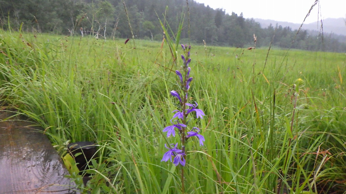 山ノ鼻から尾瀬ヶ原に向かって最初のベンチ付近の池塘です。今日は雨の波紋が水面に浮かぶヒツジグサの葉を揺らしていました。