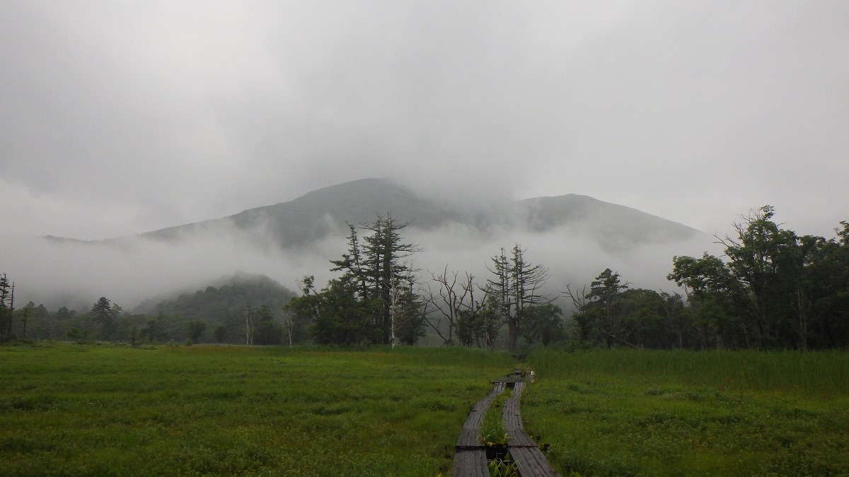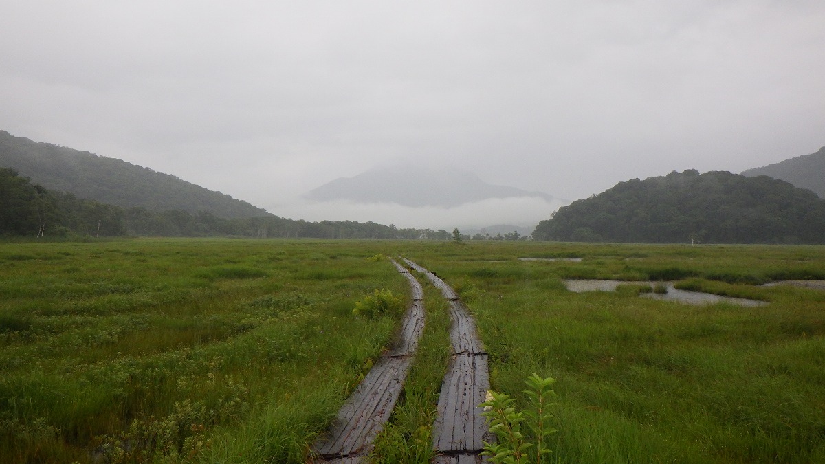 尾瀬ヶ原の西側に位置するのが至仏山、東側に位置するのが燧ヶ岳です。雨もやに霞む山々を見ながら歩く静かな湿原もまた良いものです。