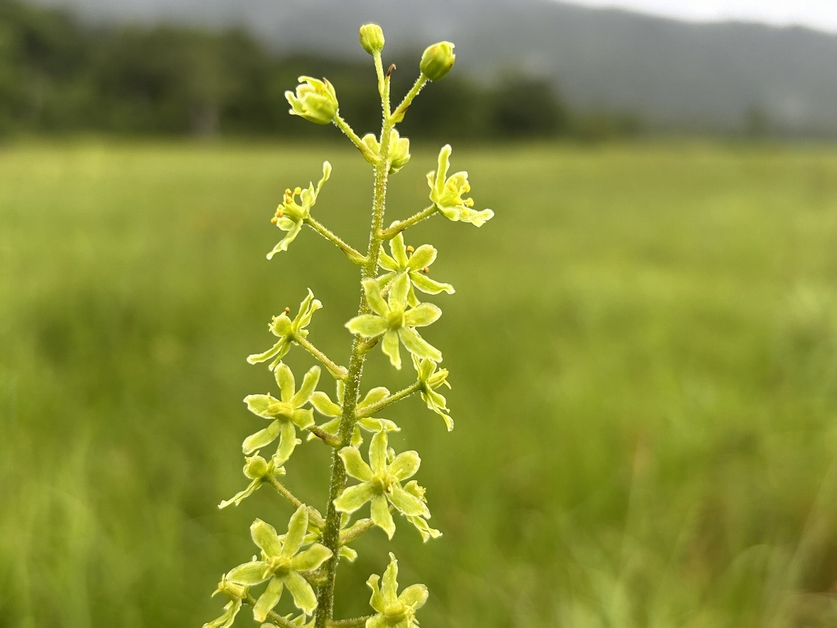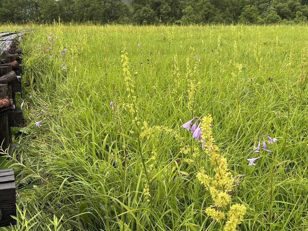 東電下の大堀橋をヨッピ吊橋方面に渡った先では、タカネアオヤギソウが群生していました。少し前にニッコウキスゲが黄色く染め上げていた場所です。昨年までは群生していなかったので、これも植生保護柵効果でしょうか。黄緑色の花は、よく見るととても可愛らしい形をしています。