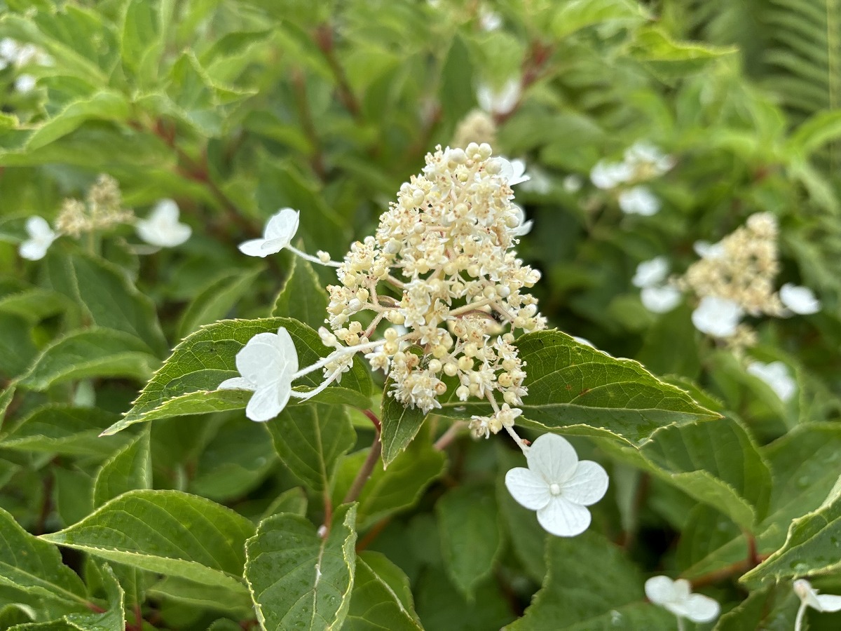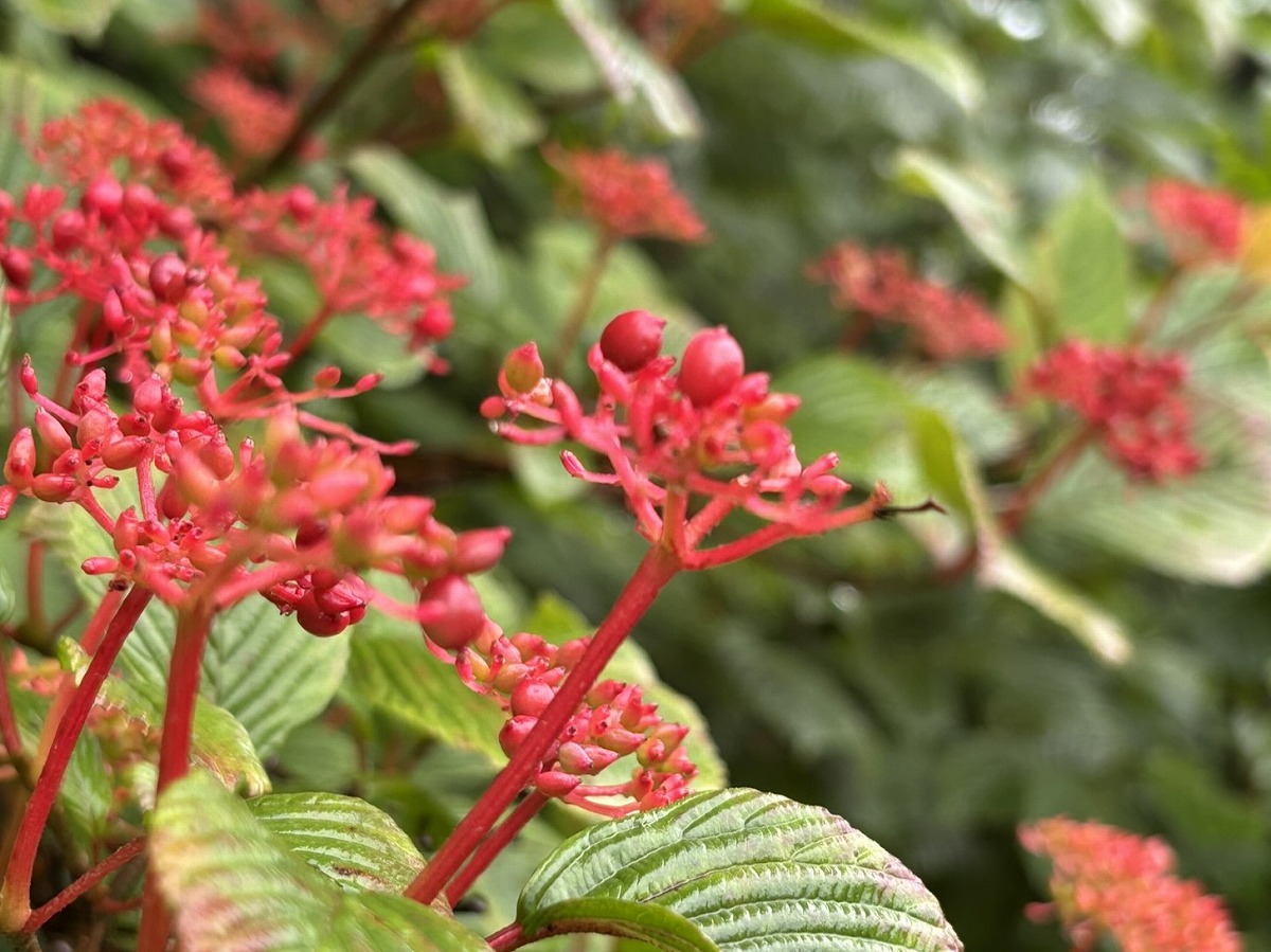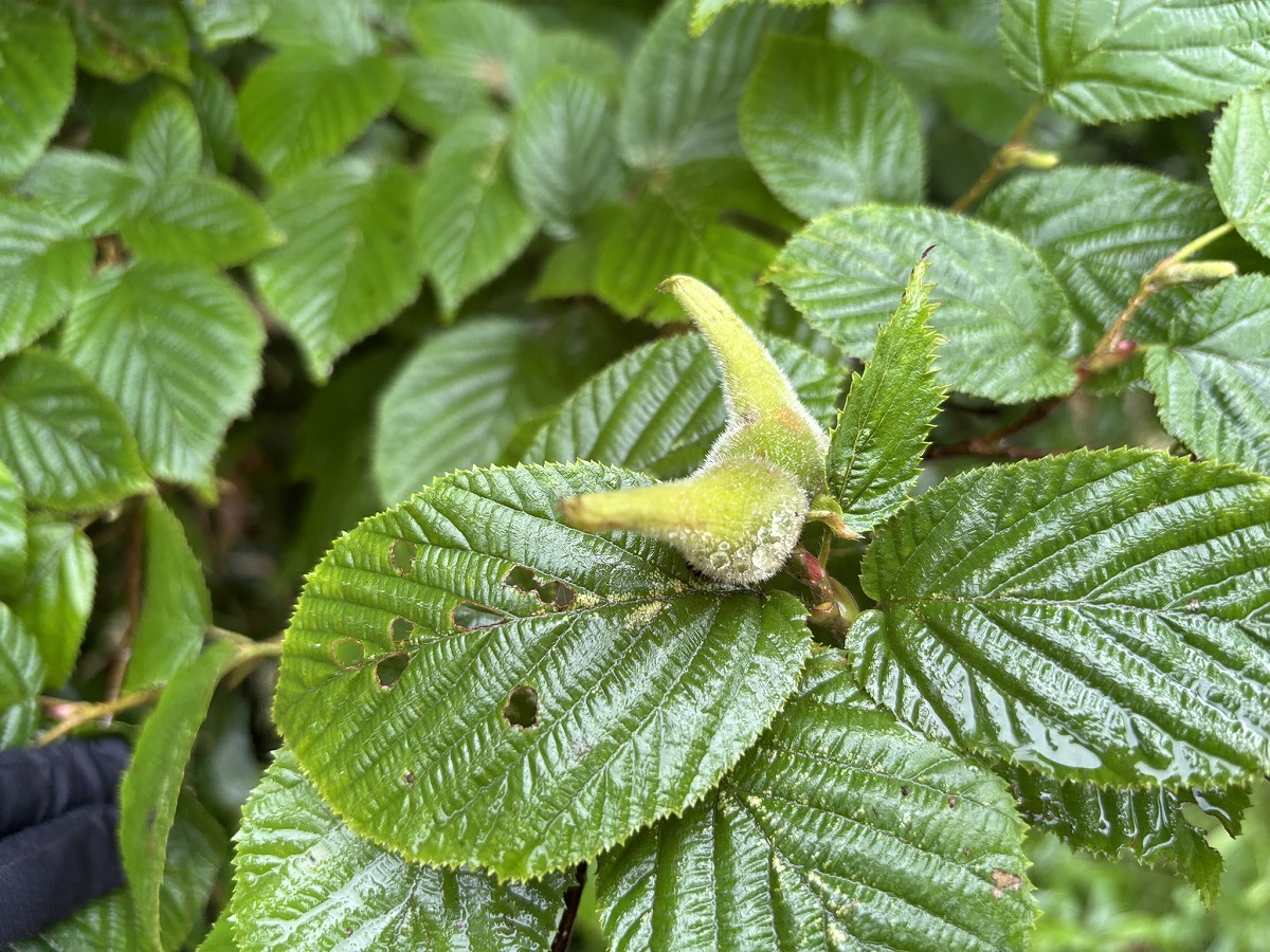 温泉小屋付近にあるケナシヤブデマリ(左写真)に、実がなっていました。真っ赤な実と花序がとても色鮮やかです。そして、その近くにユニークな形のツノハシバミの実を見つけました。花が終わり、実ができている木々が増えています。
