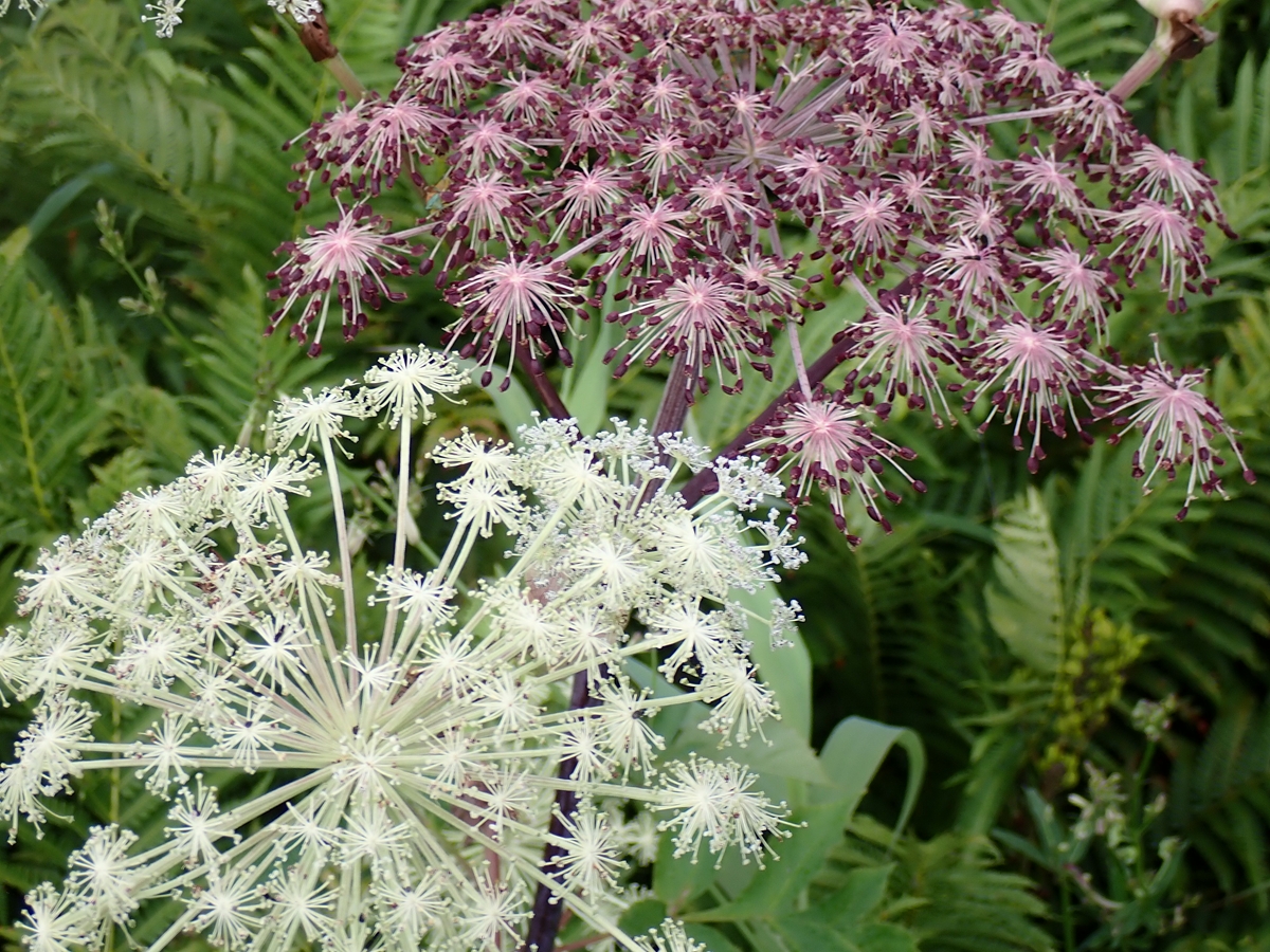 白い花が咲いた後、紫色を帯びた種になってきました。同じ株から咲いているのに、まるで違う色になるのが不思議です。