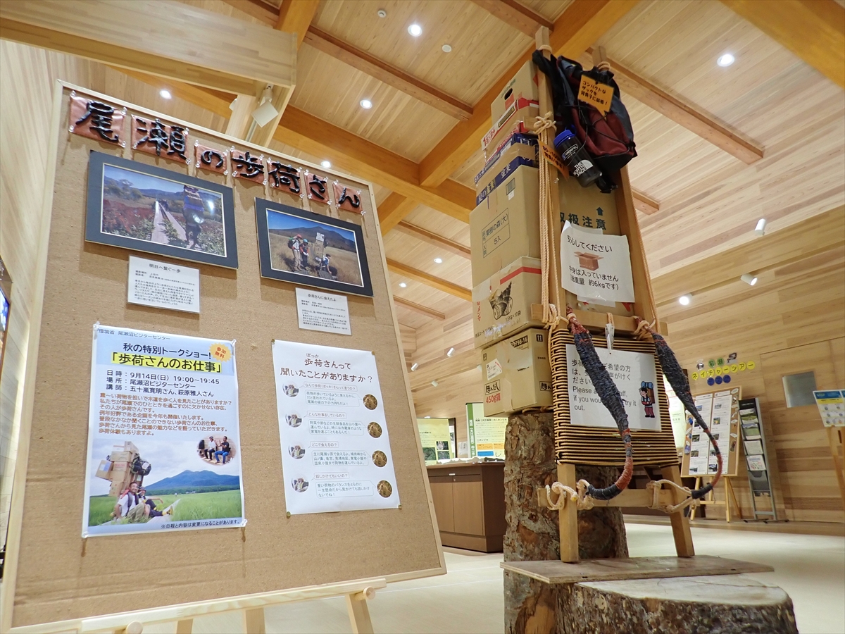 なお、9月14日に当ビジターセンターにおいて、歩荷さんイベントを開催します。歩荷の五十嵐寛明氏と萩原雅人氏のお二人を講師に招いて、「歩荷さんのお仕事」をテーマにトークショーを開きます。19時からの開催となりますので、周辺の山小屋さんにご宿泊の上ご参加ください。