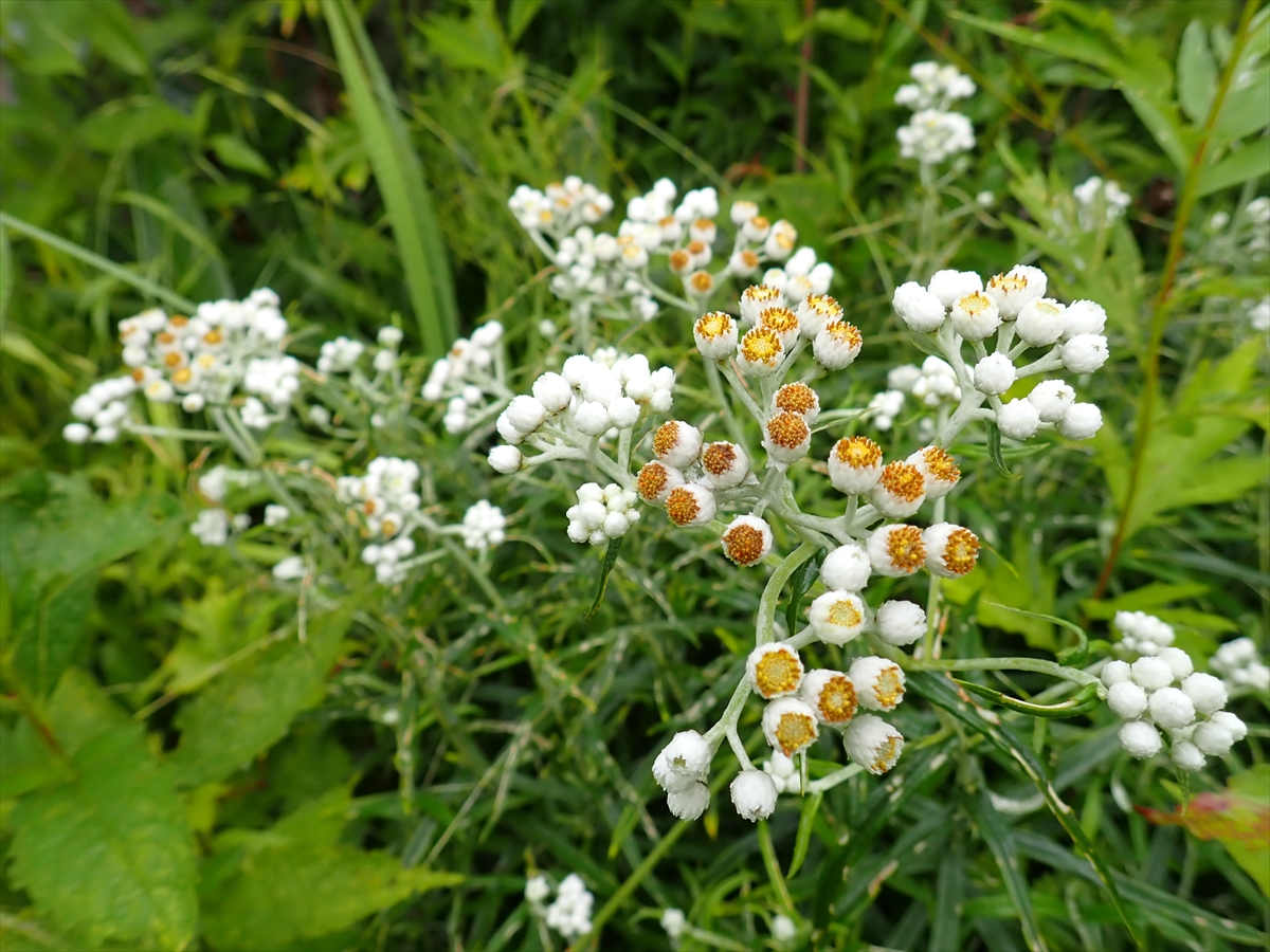 ヤマハハコの白さは草木の中で特に目立ちます。白い花弁のように見えるのは総包片と呼ばれる葉が変化したもので、中央の黄色い部分が花となります。