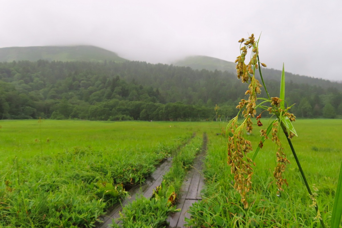 今朝の研究見本園はしとしとと雨が降り、草花は雫をまとい、至仏山も靄に煙っていました。アブラガヤもだんだんと色づいてきましたね。