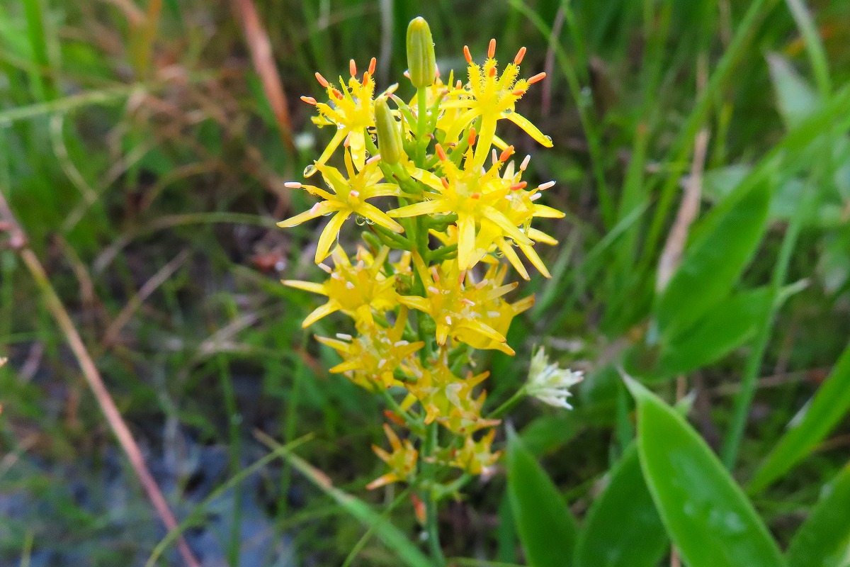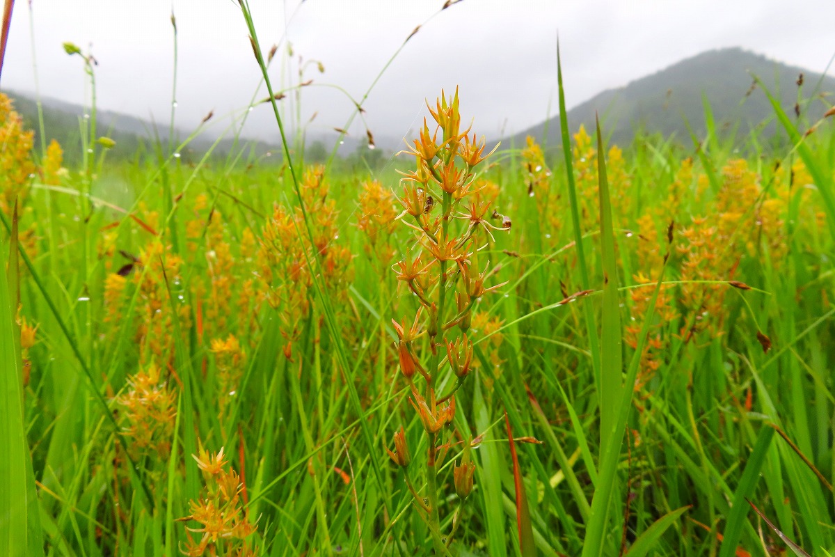 キンコウカの群生は、鮮やかな花のレモン色から実の山吹色の絨毯へと変わりましたが、まだ鮮やかな花も残っています。