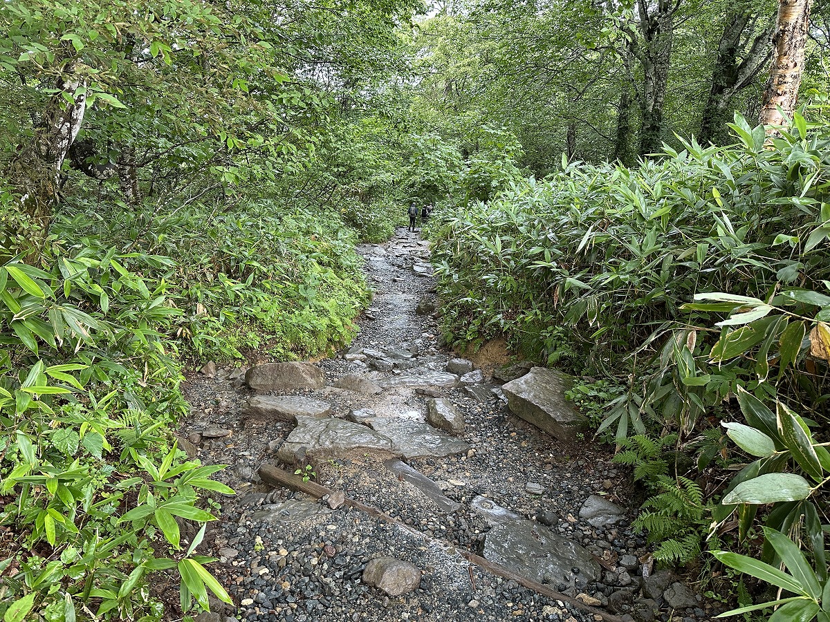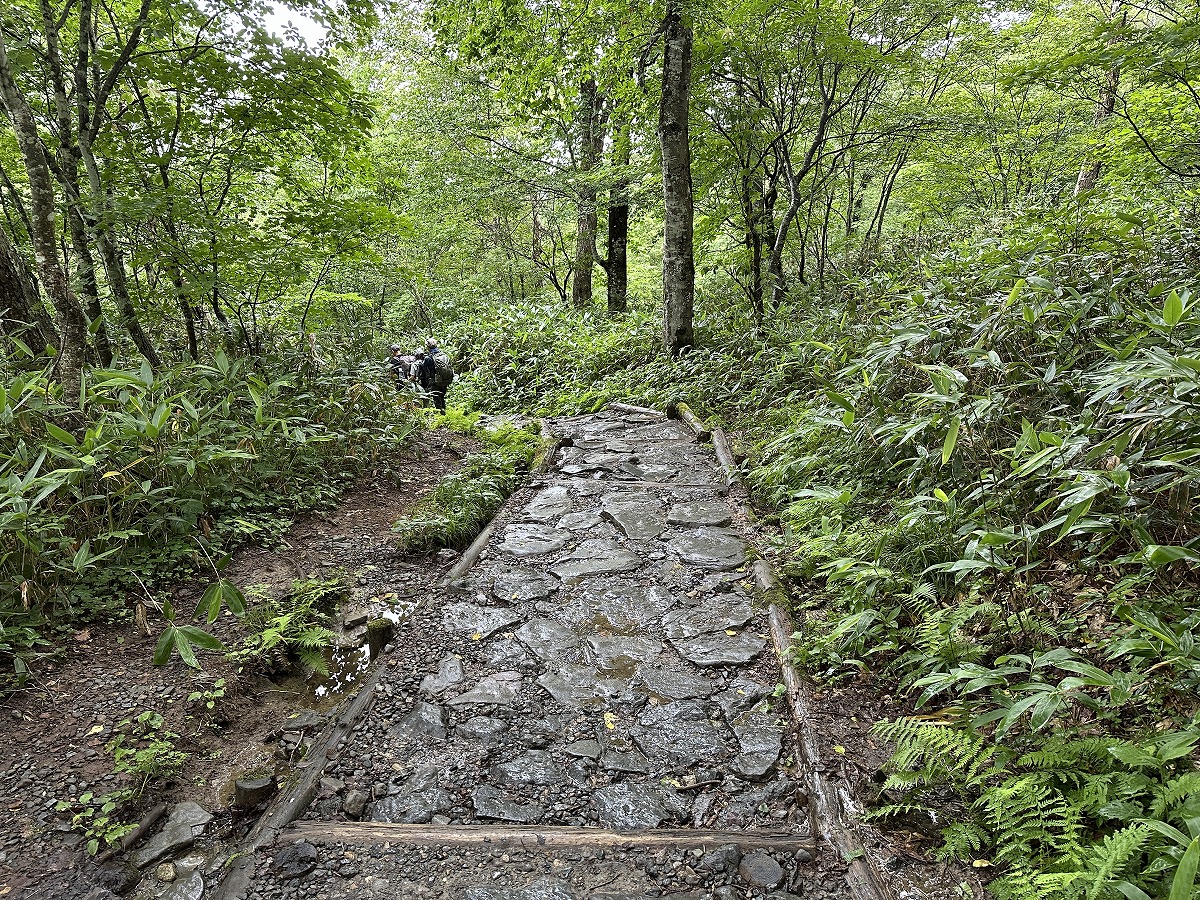 鳩待峠入山口から入ると大きな石が敷かれた登山道となります。雨で濡れていると滑りやすいので注意してお進みください。