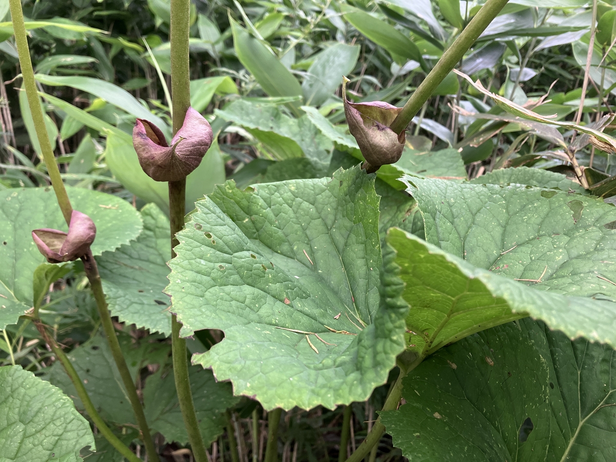 マルバダケブキは、茎やつぼみが伸びる前は苞(ほう)に包まれています。大切に保護されているのですね。無事に茎が伸びてつぼみが開くと、必要のなくなった苞は枯れてしまいます。枯れる前の苞は、とがった部分の先にまた葉が付いているようなおもしろい形をしているので、よく観察してみてください。