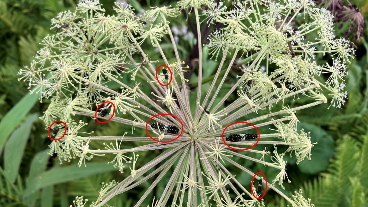 キアゲハの幼虫はセリ科の植物が大好き。花も葉も実も、むしゃむしゃ食べて大きくなります。この植物はミヤマシシウドです。よく見ると、雄しべの先が食べられてなくなっている所がありますよ。