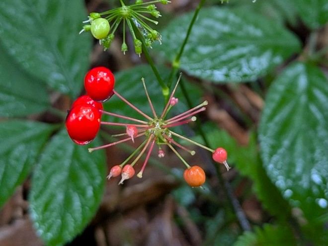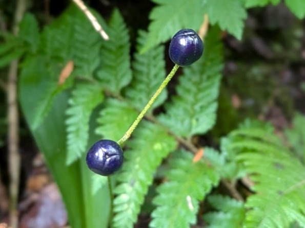 オオバタケシマランの実が真っ赤に色づいていました。くるんと曲がった柄が可愛いですね。