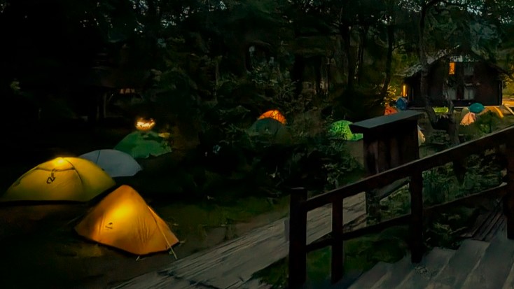 夕方には、テント場にほんのり明かりが灯り、昼間の喧騒の余韻を残しながら日が暮れていきました。
