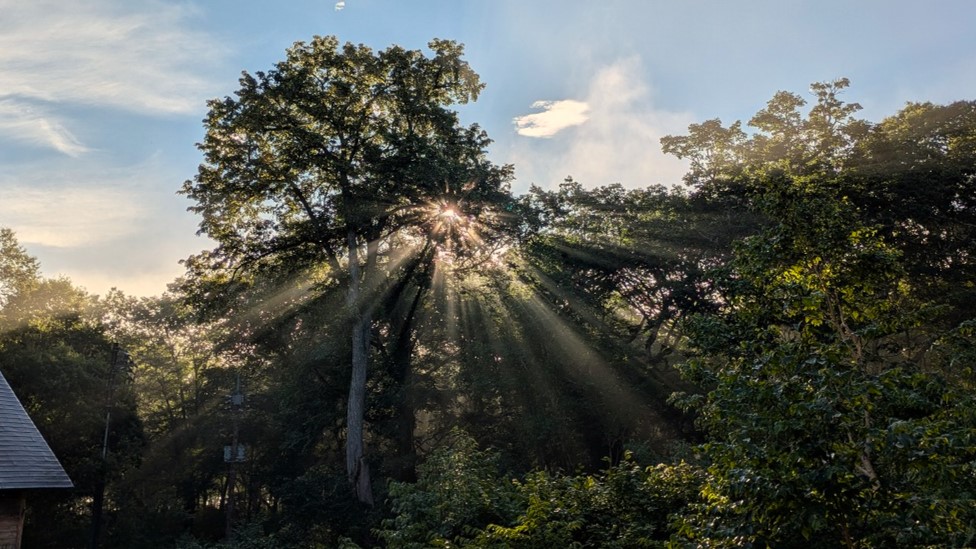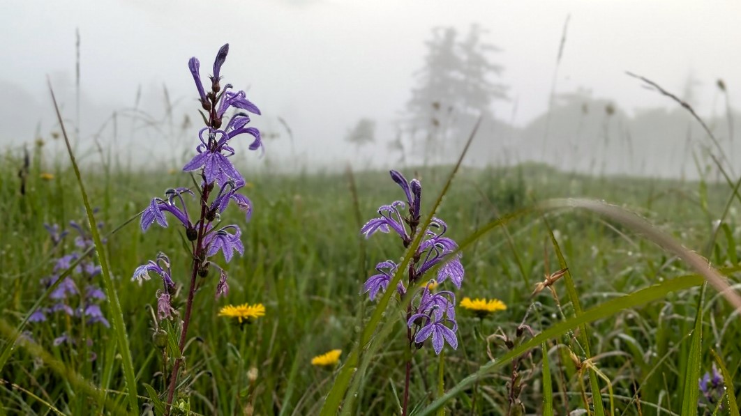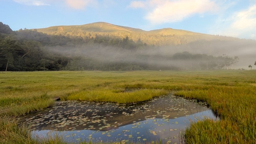 今朝は靄のかかった湿原に木々の間から陽射しが差し込んで、花々が目覚め始めました。