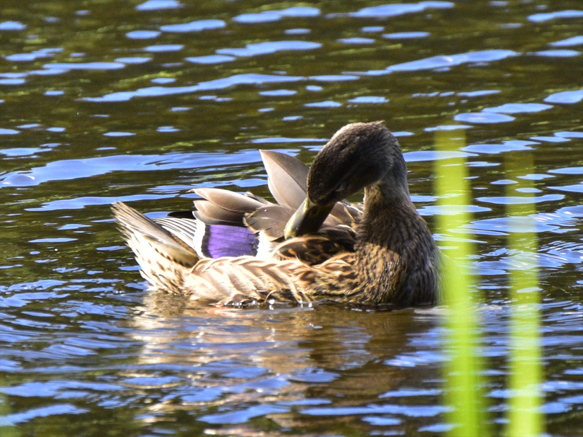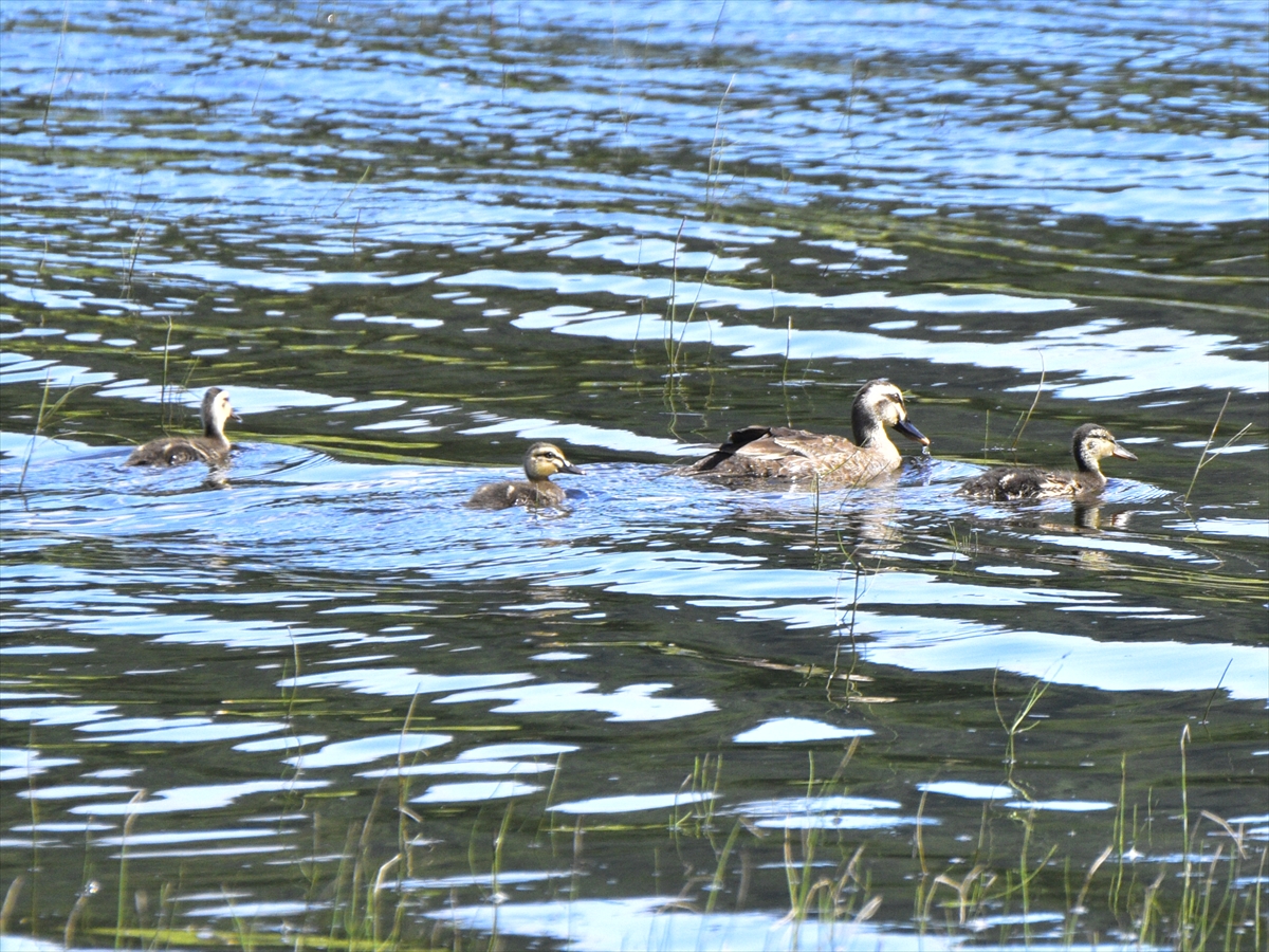 オオバンに比べて少し大きな幼鳥を連れたカルガモの親子にも出会いました。幼鳥たちは体が大きくなったためか、みんなでべったり集まって泳ぐということはなく、少しだけ親鳥から離れて思い思いに漂っていました。
