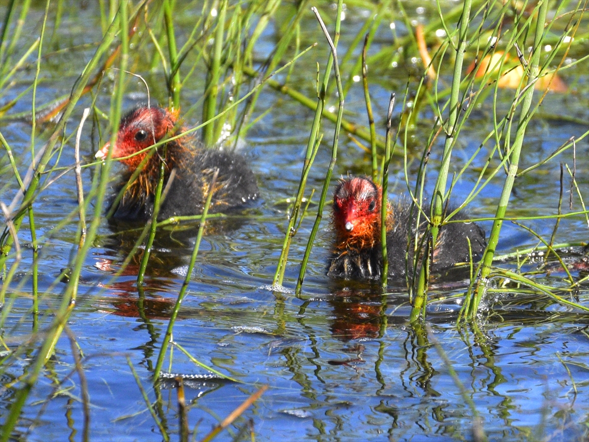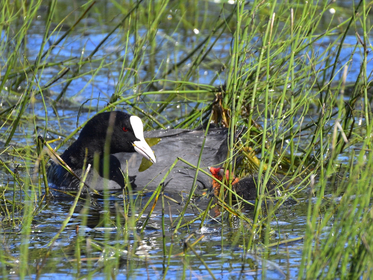 オオバンの幼鳥は額の白い親鳥に比べて、ぎょっとするくらい真っ赤な顔をしています。親鳥から水草の種をもらいながら、後ろをついて泳ぐ姿が見られました。