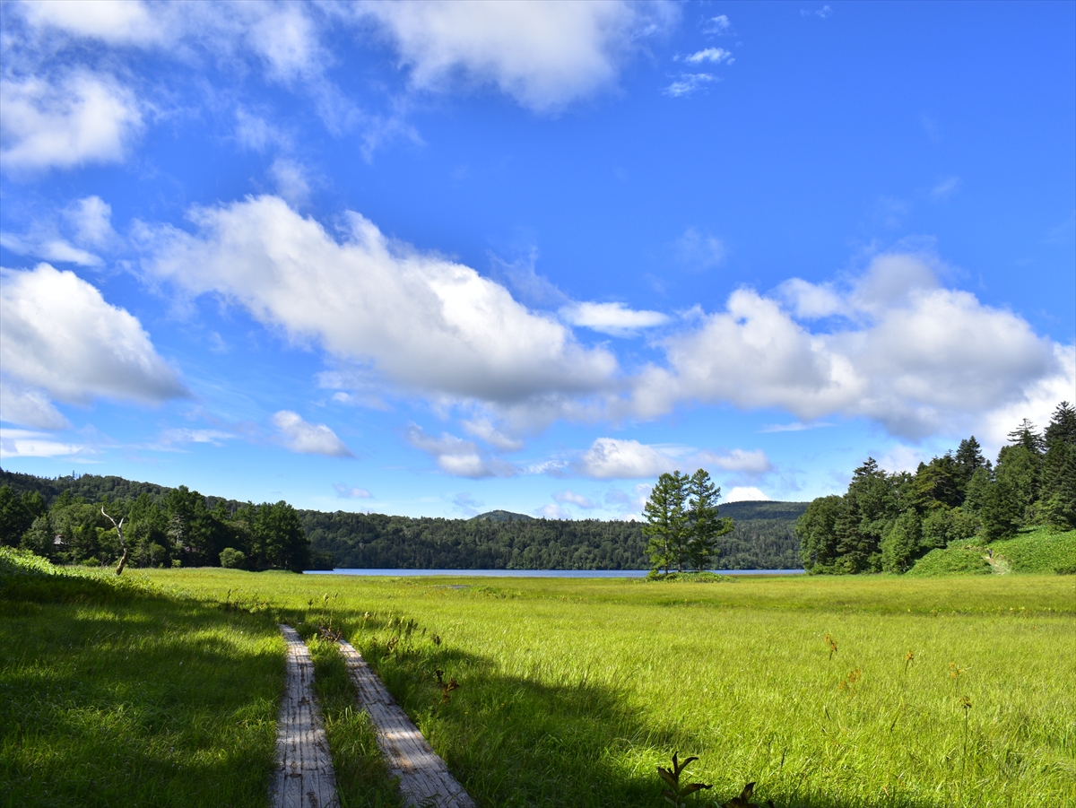 今朝は清々しい青空が広がり、緑の湿原の上に白い雲が浮かぶ、夏の尾瀬らしい景色が広がっていました。