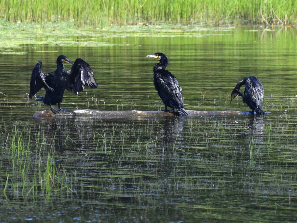 尾瀬沼では、水面に浮かぶ倒木や岩の上で日向ぼっこをしているカワウの姿をよく見かけます。同じ水鳥であるカモの仲間には、尾の付け根にある「尾脂腺(びしせん)」から脂を分泌し、それをくちばしで羽に塗って防水性を保つ習性があります。