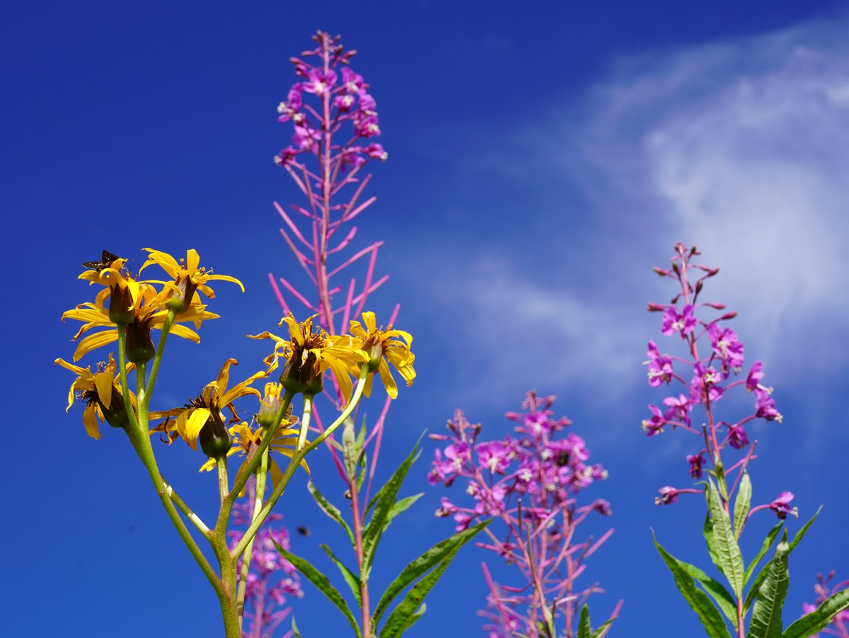 【青空に映えるマルバタケブキとヤナギラン】