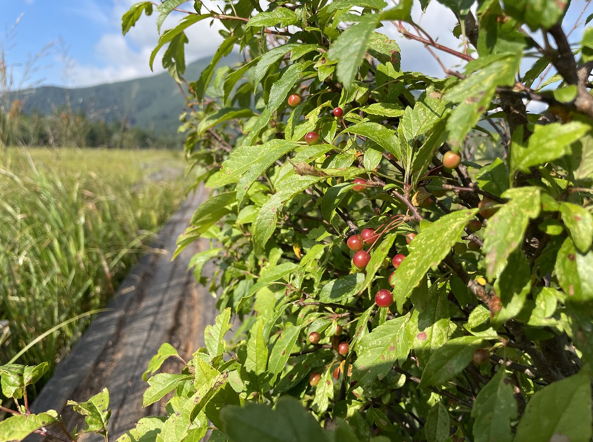 木道脇に高さ1mほどのズミの木が生えており、可愛らしいサクランボのような赤い実がなっていました。鳥たちはこの実を食べて、糞と一緒にズミの種子を体内から排出します。ズミの木は、鳥たちに実を食べてもらうことによって分布を広げることができています。森の生態系を支える大切な仕組みとして、鳥たちはなくてはならない存在です。