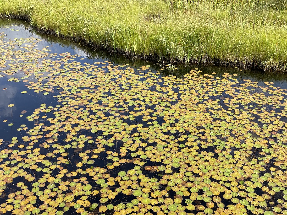 池塘(ちとう)では、水底に根を張ったヒツジグサの葉っぱがびっしりと浮いています。最初は緑色だった葉が、赤みのある黄緑や黄色に紅葉してきました。樹木の紅葉だけでなく、池塘に浮かぶ葉っぱの色の変化も楽しむことができるでしょう。