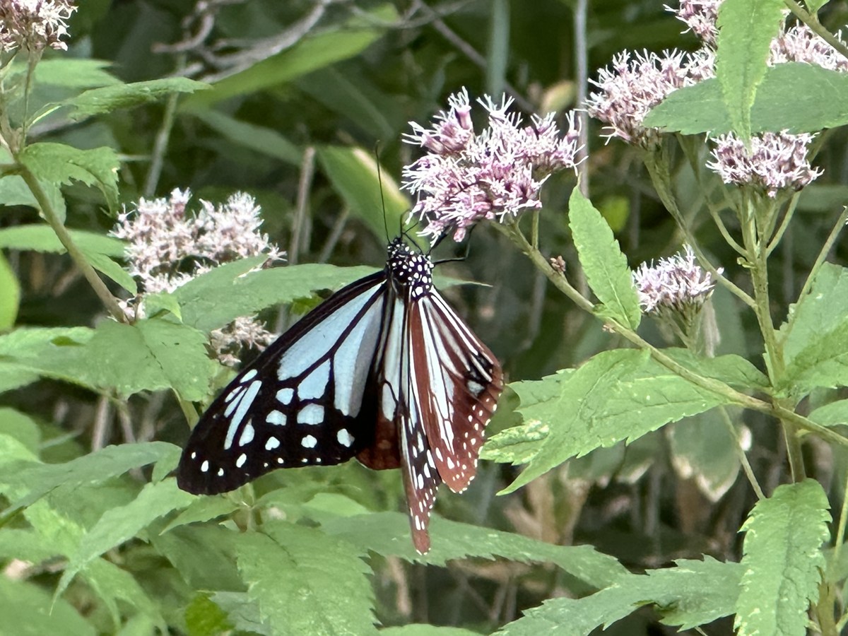 さて、8月22日(金)、見晴にてナイトハイク&星空観察会を開催したので、イベントの様子を報告します。イベント前に、見晴周辺にて下見を行ったのですが、ヨツバヒヨドリのふわふわとした可愛らしい花に目を奪われていると、アサギマダラが目の前をふんわりと通り過ぎていきました。