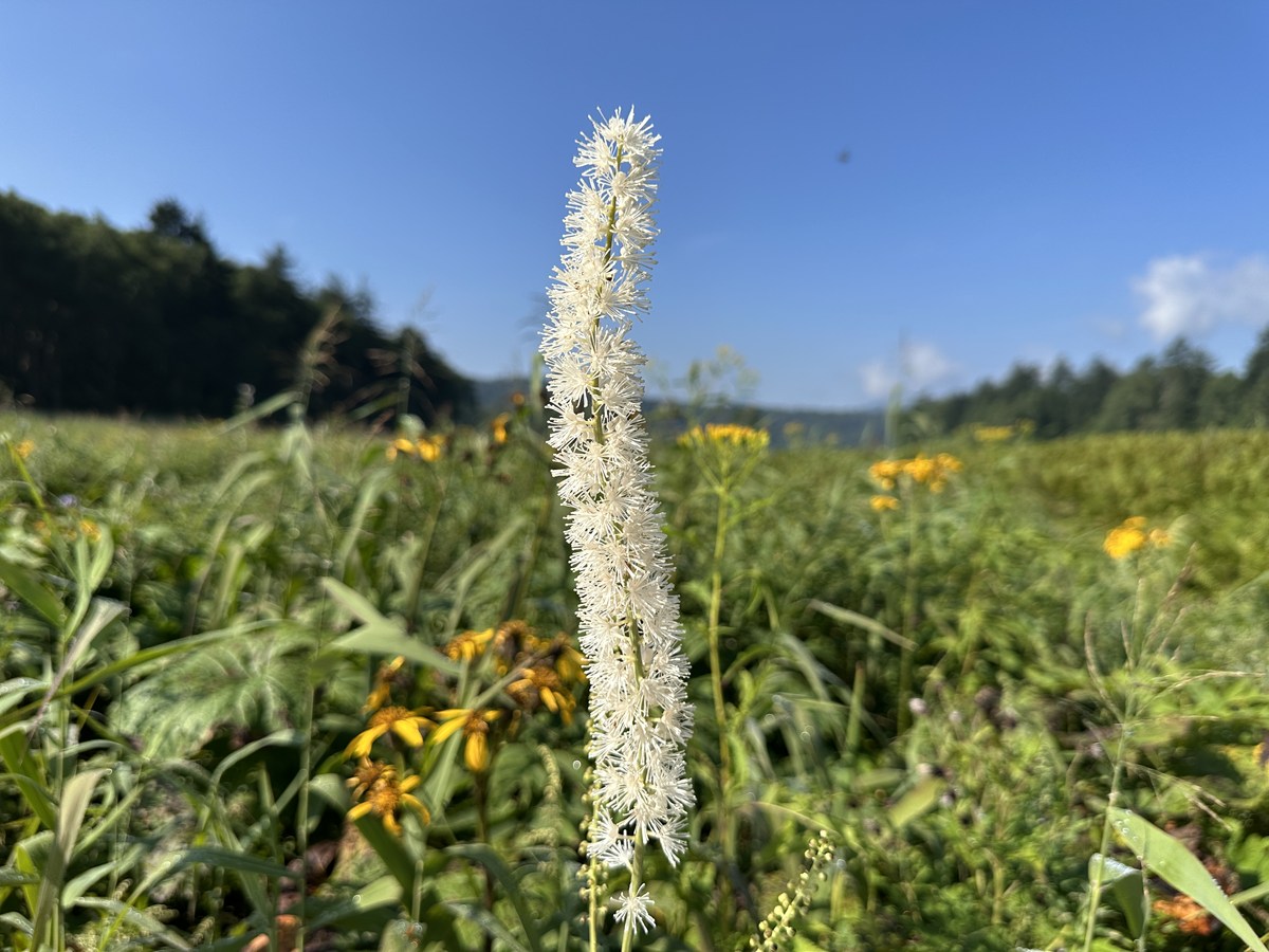 サラシナショウマが、大江第二橋付近で目立ってきました。橋の上から大江川を眺めると、大江川の流れに沿って白いブラシのような花がヒョコヒョコと顔を出しています。大江第二橋周辺は、オクトリカブト、マルバダケブキ、ツリガネニンジン、ミヤマセンキュウなど、様々な花をお楽しみただける見どころ満載のスポットです。