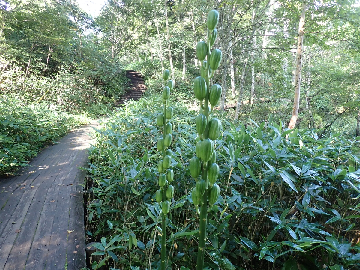 大江湿原から林内に入ったところにオオウバユリが実をつけています。道行く人の背丈よりも高さのあるその姿は、花の時も実になってからも、独特の存在感を放っていました。
