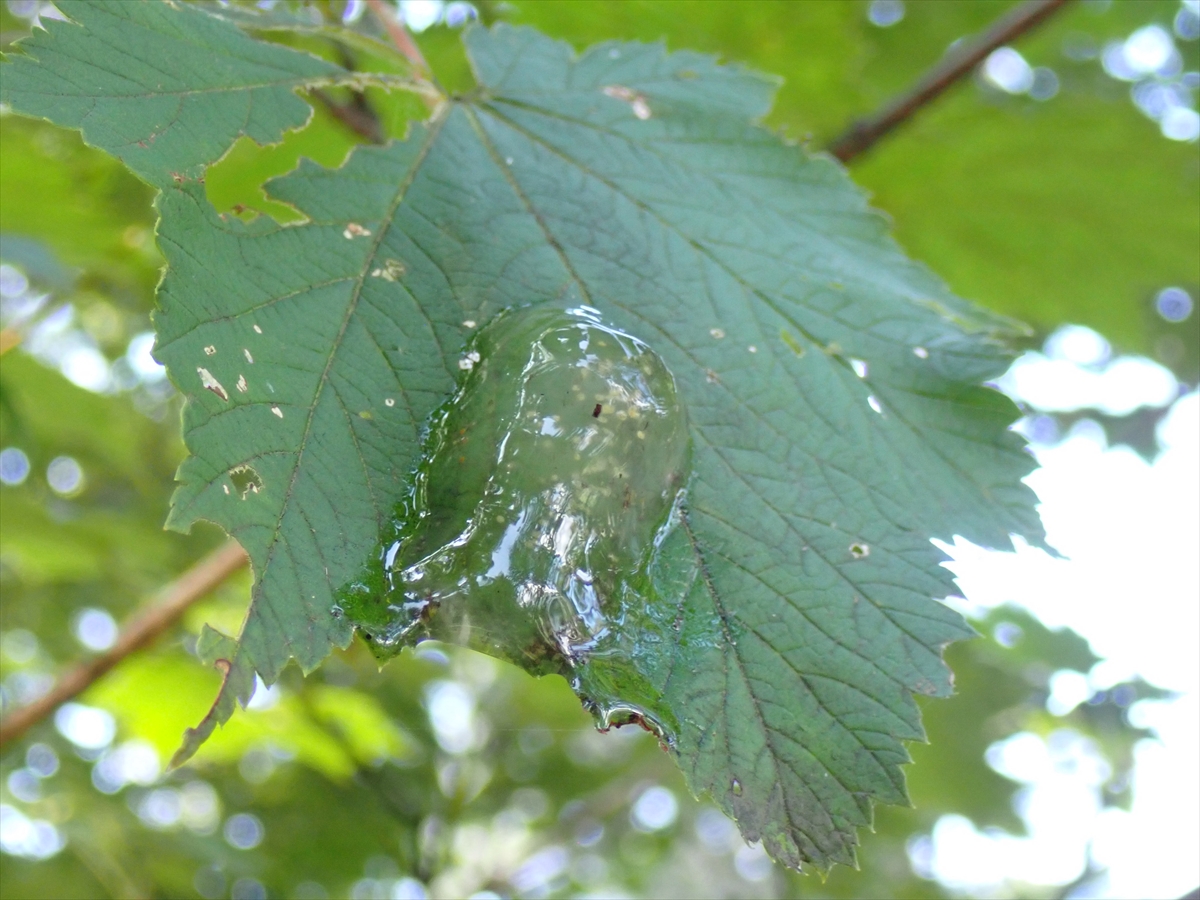 オオウバユリのすぐ近くで、頭上にトビケラの卵塊を見つけました。目線の高さよりも高いところにもあるので、気をつけてください。