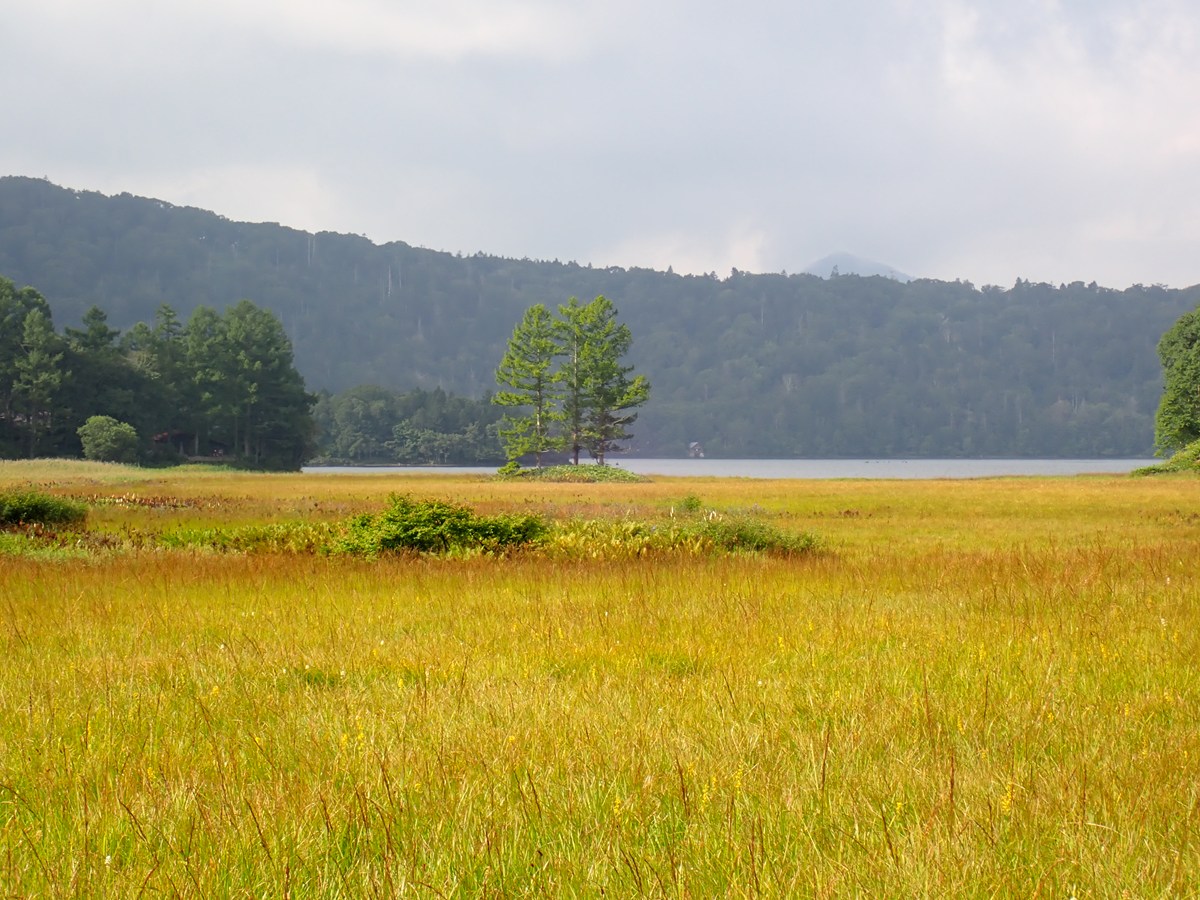 さて、大江湿原は草紅葉が始まりました。草の上の方が枯れてきて、日に当たると黄色く輝きます。風が吹くと植物がそよそよと揺れて、秋の気配を感じます。
