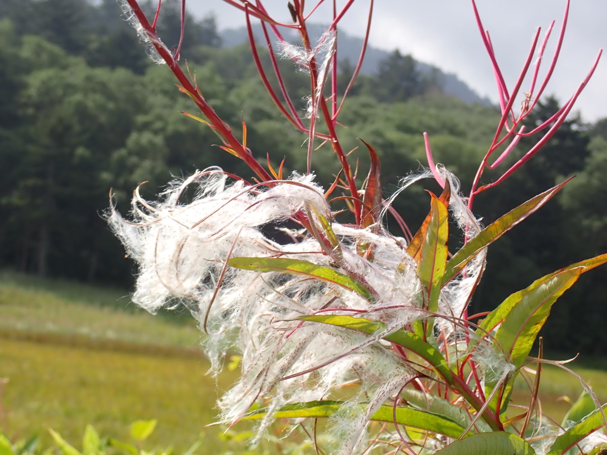 ピンク色の花をつけていたヤナギラン。平野家の墓周辺では、ヤナギランが種になり始めていました。上の方に見えるピンク色のさやの中に、綿毛に包まれた種が入っています。さやがはじけると、種は綿毛と一緒に風に乗って飛んでいきます。来年もたくさんの花を咲かせてくれるといいですね。
