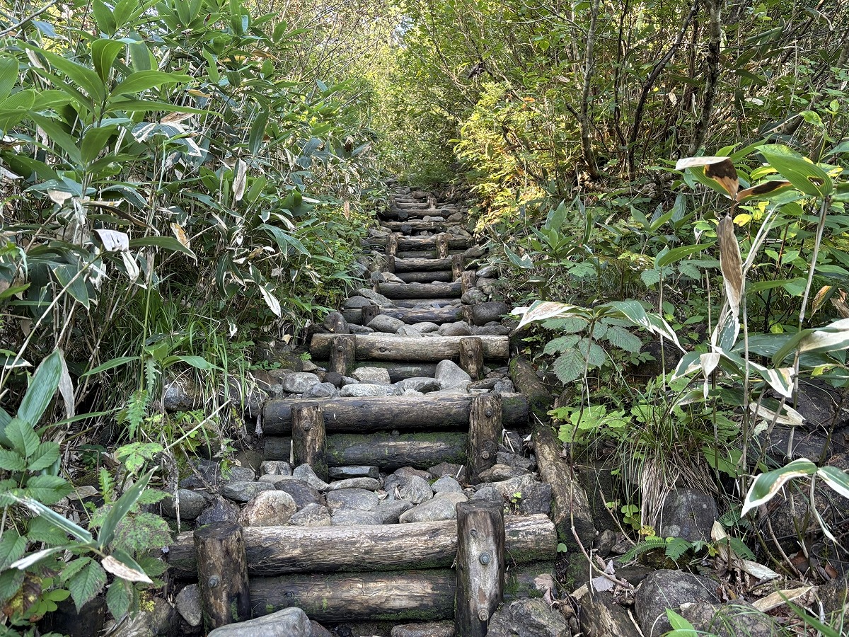 東面登山道入口は、研究見本園の中を通り抜けたところにあります。初めは樹林帯の中を進みます。森林限界を越えると蛇紋岩や木製階段が出てきます。蛇紋岩は滑りやすく、木製階段は傷んだ箇所が多いので、足の置き場に気を付けてください。