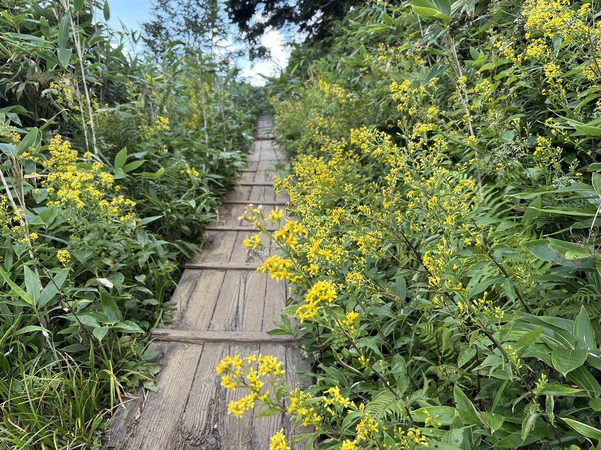 さらに下って行くと、ミヤマアキノキリンソウにつつまれたかのような場所がありました。花の少ない区間なので、心が少し華やぎます。鳩待峠まであと1時間ほど。足が疲れてくる頃ですが、つまずきやスリップに注意して鳩待峠まで無事下山しましょう。