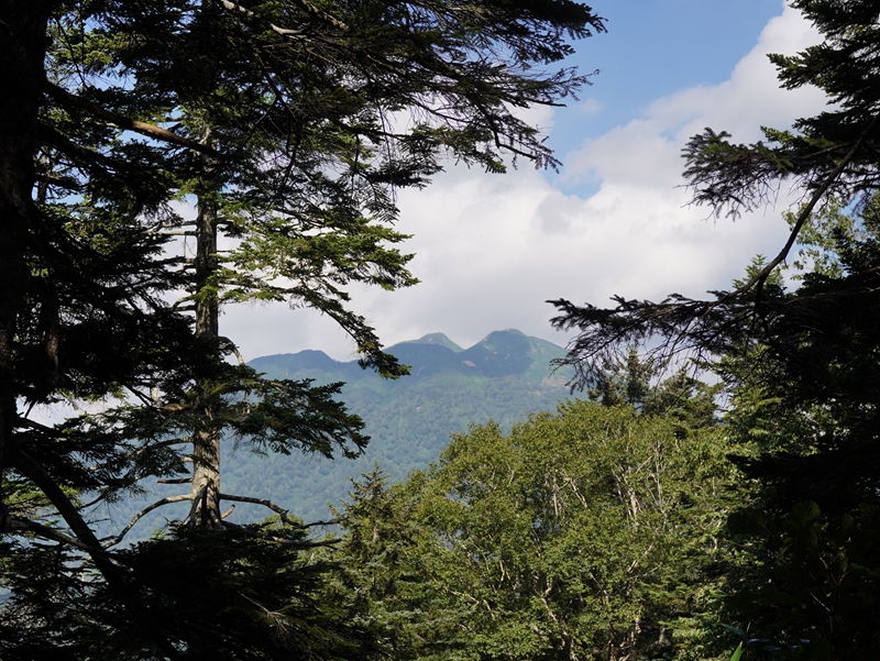 尾瀬沼キャンプ場の奥より、小淵沢田代までの登山道が続いていきます。途中、つづら折りの急坂を息も絶え絶え登っていくと、樹木の間から燧ヶ岳と青く光る尾瀬沼をのぞむことができます。ビジターセンター周辺から燧ヶ岳を見上げると、手前の御池岳に阻まれて最高峰の柴安嵓をはっきりと確認するのは難しいのですが、ここからはしっかりと柴安嵓(画像では真ん中奥のピーク)を眺めることができました。