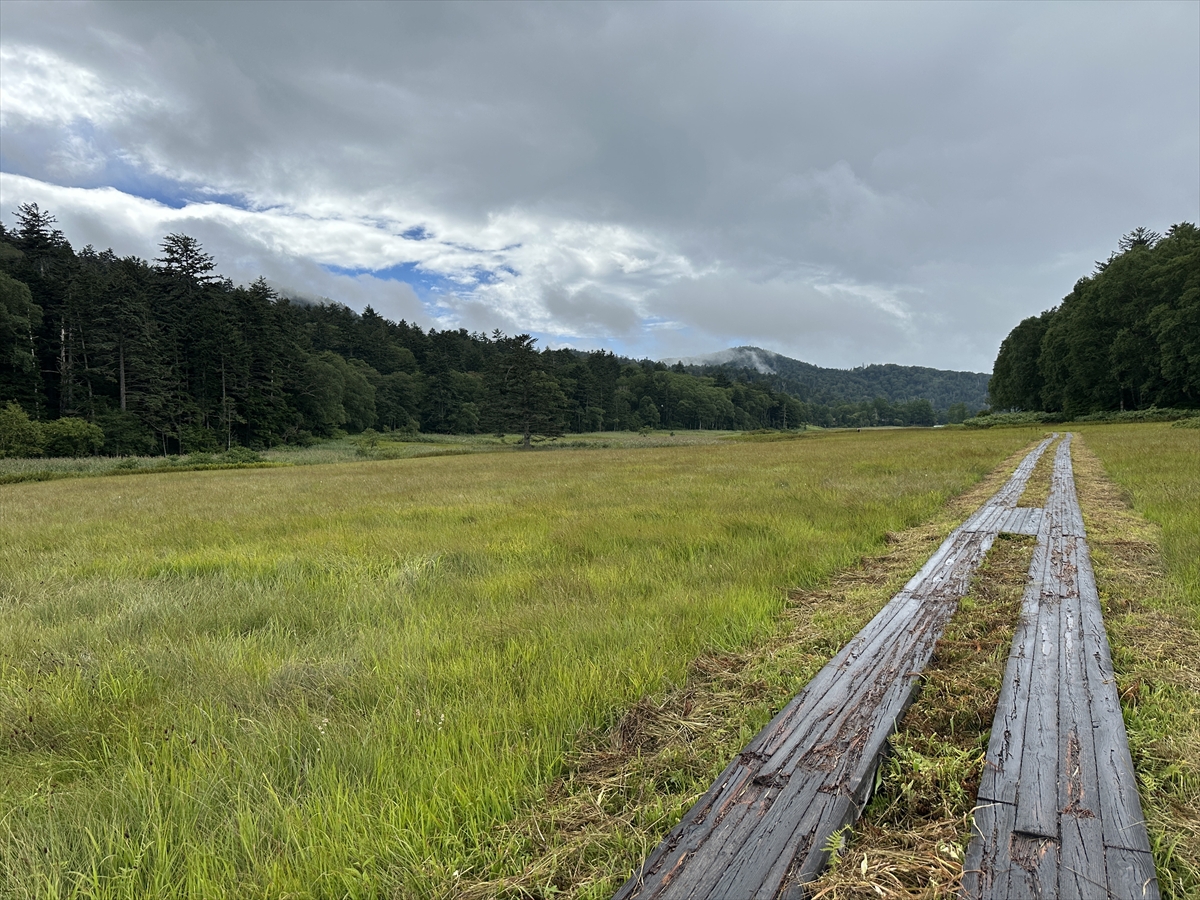 尾瀬沼周辺は、早朝から雨が降ったり止んだりを繰り返す天気です。燧ヶ岳上空の厚い雲は足早に流れていき、時折、青空が見えて陽がさすものの、天候は不安定です。