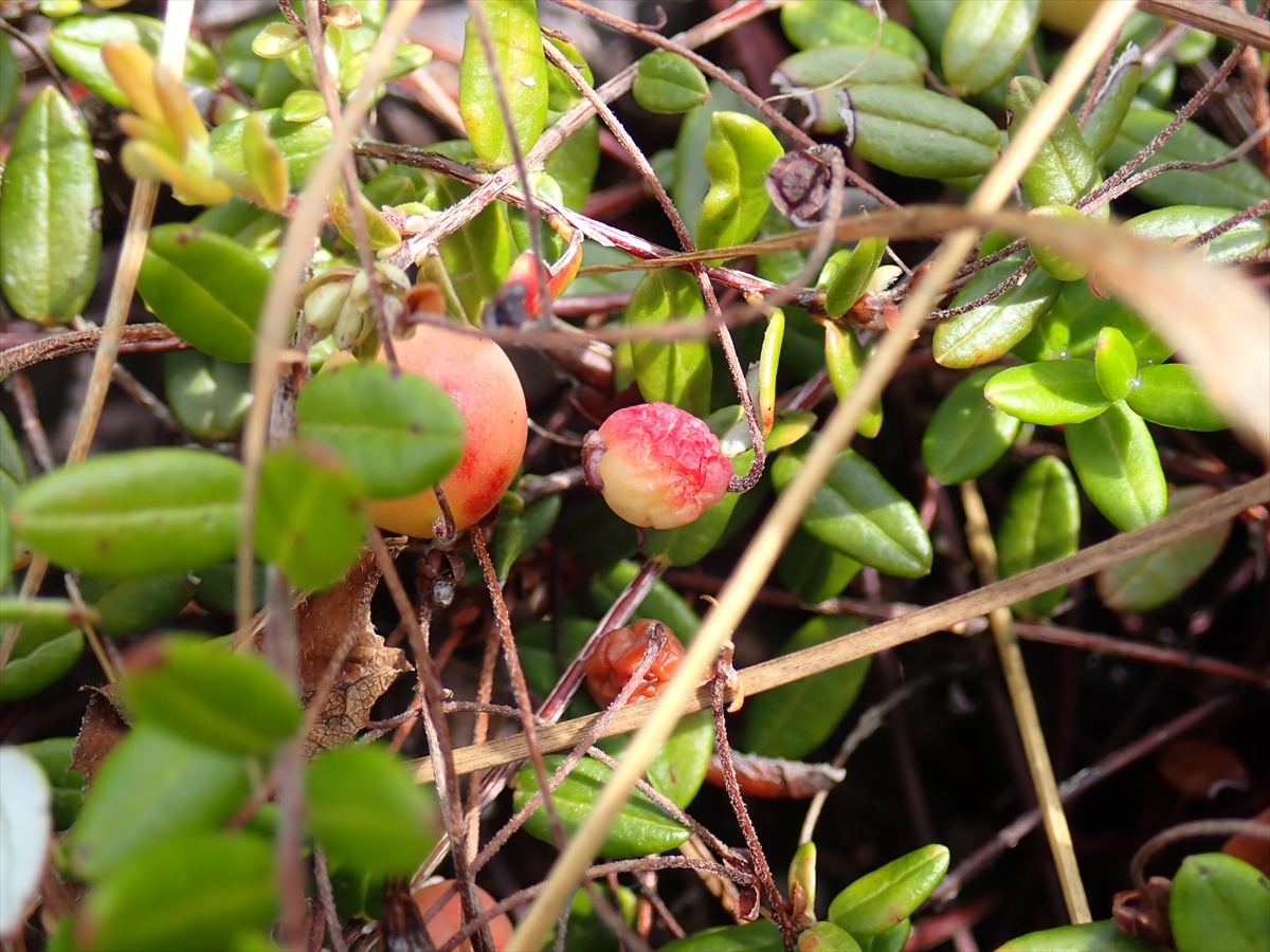 こちらも大江湿原にある、ツルコケモモです。湿原内に数多く見られますが、地面に這うように延びてとても低い位置に生育しているため、注意深く確認しないと見逃してしまいます。