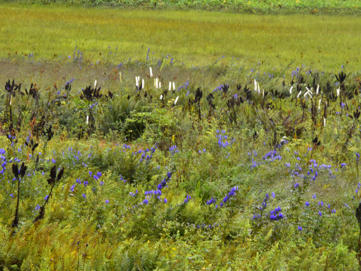 山霧に包まれた大江湿原では背景の山肌がぼやけ、いつも以上に三本カラマツがはっきりと見えました。湿原の緑も少しずつ秋らしい色に染まり、オクトリカブトの青、サラシナショウマの白、コバイケイソウの焦茶がアクセントを加えていました。