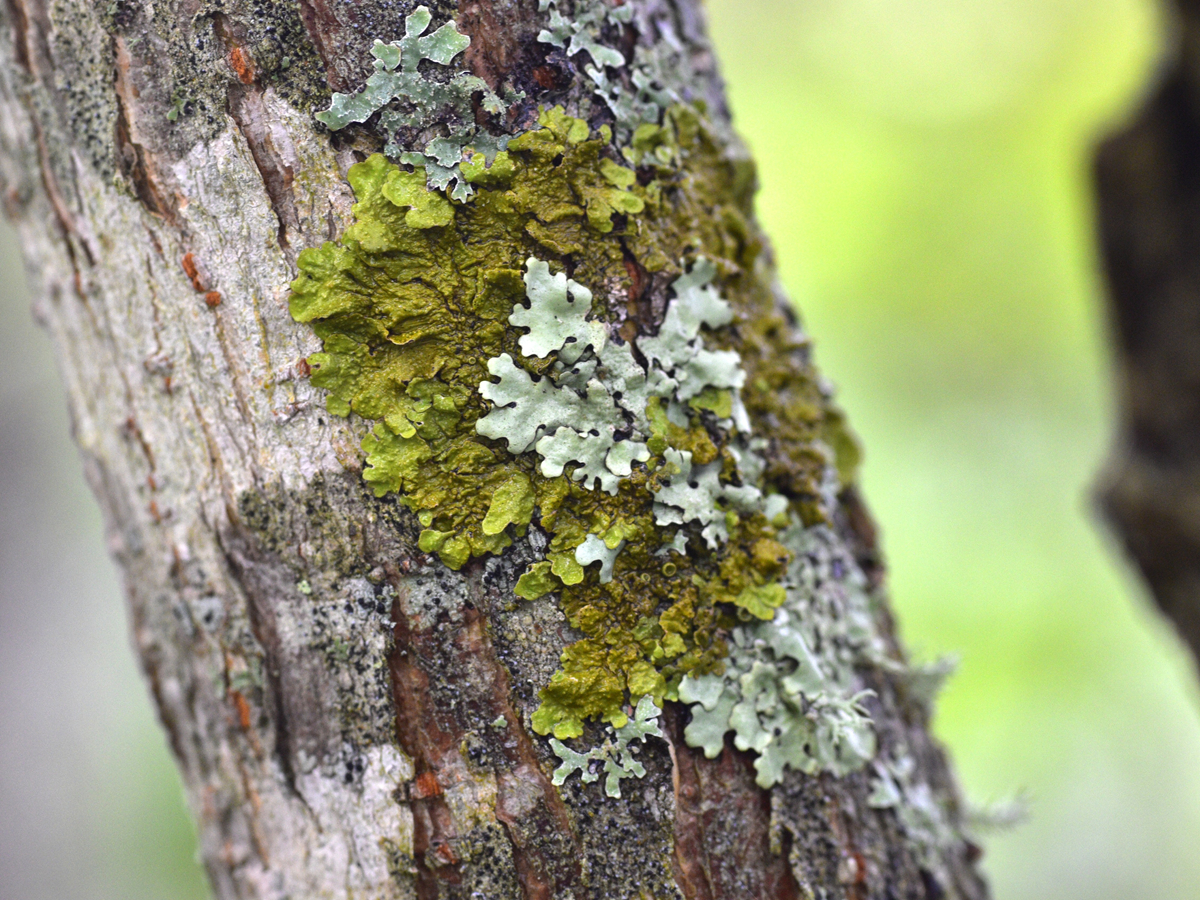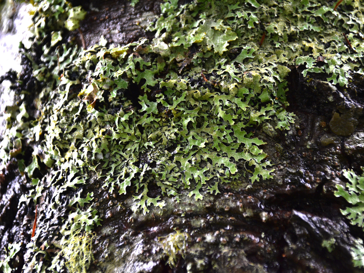 名前に「コケ」とありますが、実はこのウメノキゴケの仲間、植物のコケとはまったく別の仲間で、地衣類(ちいるい)と呼ばれる生物です。地衣類は、菌類(キノコに近い仲間)と緑藻類、あるいはシアノバクテリアが共生し、2種類以上の生き物が力を合わせて1つの体のように暮らしています。