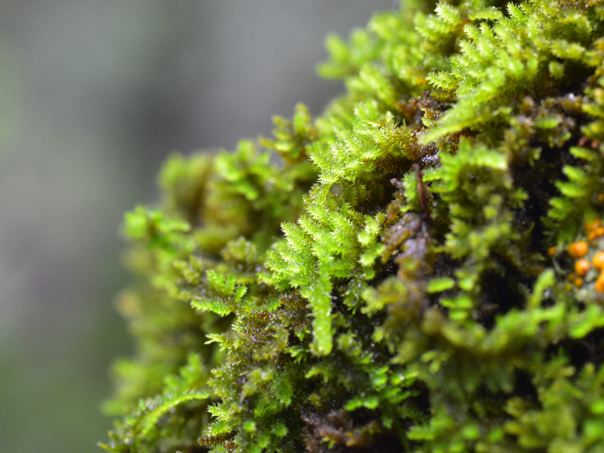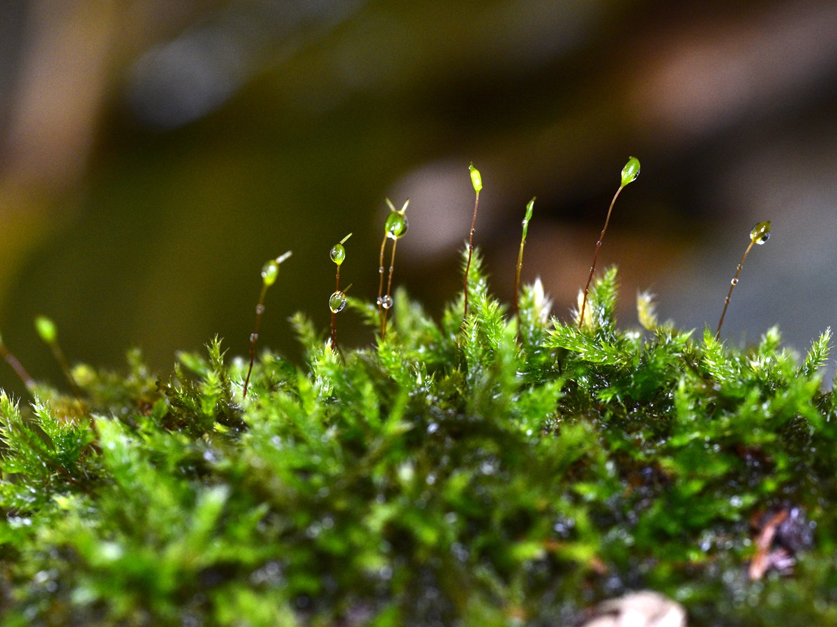 こちらはいわゆるコケ植物としてのコケ。細胞内に葉緑体を持ち、光合成を行い生活しています。体内に維管束(水を運ぶ道管と栄養分を運ぶ師管)を持たないため、体中に水を巡らすことは進化した植物に比べて少し苦手です。そのため水気の多いところを好んで生育しています。