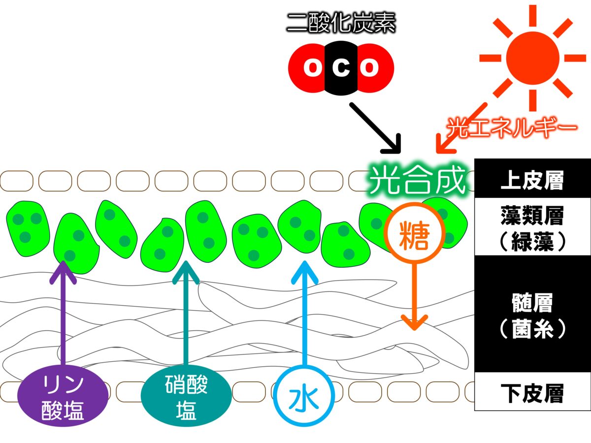 共生している緑藻類は、植物と同じように太陽の光エネルギーを利用して、大気中の二酸化炭素から栄養分である糖(炭水化物)を作り出します。そして、そのうちの大部分を菌類にわたしています。