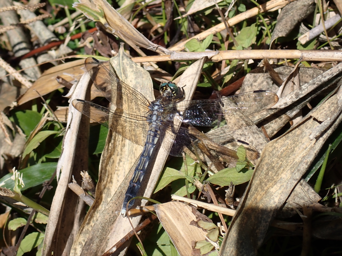 尾瀬のトンボもずいぶん数が減りました。そんな中で見つけた少し大きめのこのトンボは、シオカラトンボの若い個体と思われます。緑色の複眼が大変美しいですね。
