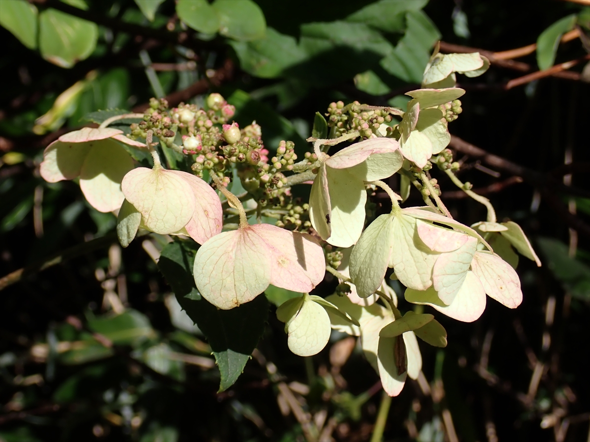 大江湿原から少し林内に入ったところにあるノリウツギも、お花から実になりつつあります。周りの花びらのように見えるものは装飾花と呼ばれる萼片で、受粉のためより多くの虫を集められるよう発達しました。