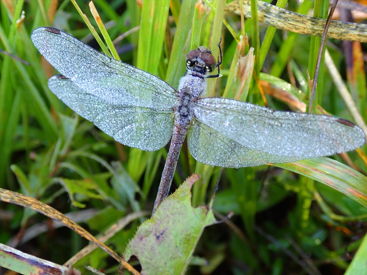 草の陰で、全身を朝露で濡らしたアキアカネを見つけました。とても体重の軽いトンボは、水分を落とさないと飛行能力を発揮することができません。水滴で濡れた体は、日光に当てるか、風で乾かしてから飛び立つのです。