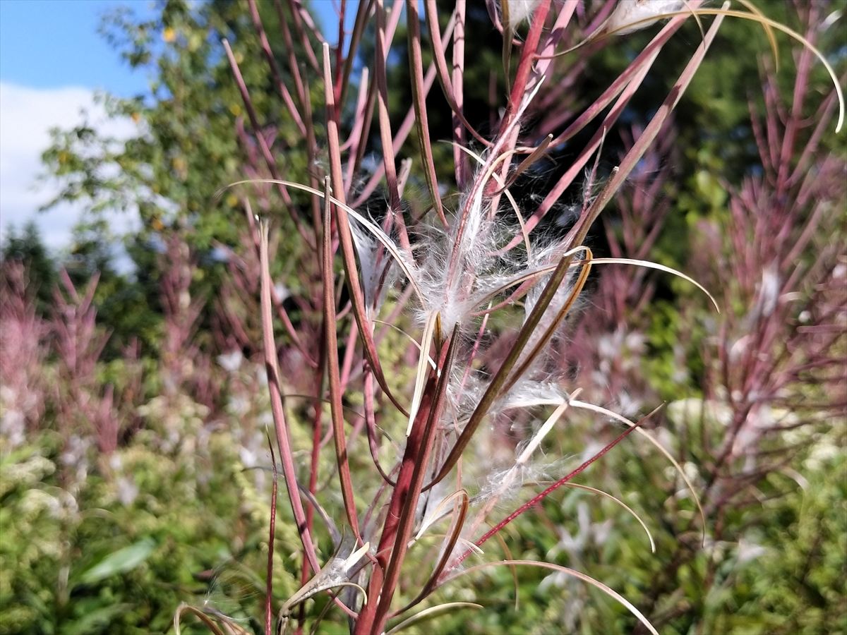 ピンク色の花が終わり、さや状の実が開いて白い綿毛(種子)を飛ばしはじめました。