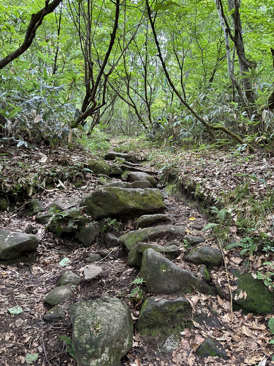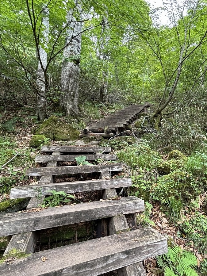 尾瀬ヶ原にある竜宮十字路を南に進んだ先が、長沢新道です。初めは広葉樹林内の平坦な登山道ですが、長沢橋を渡るとまもなく傾斜が増し、大きな石が露出した道や木製階段がしばらく続きます。