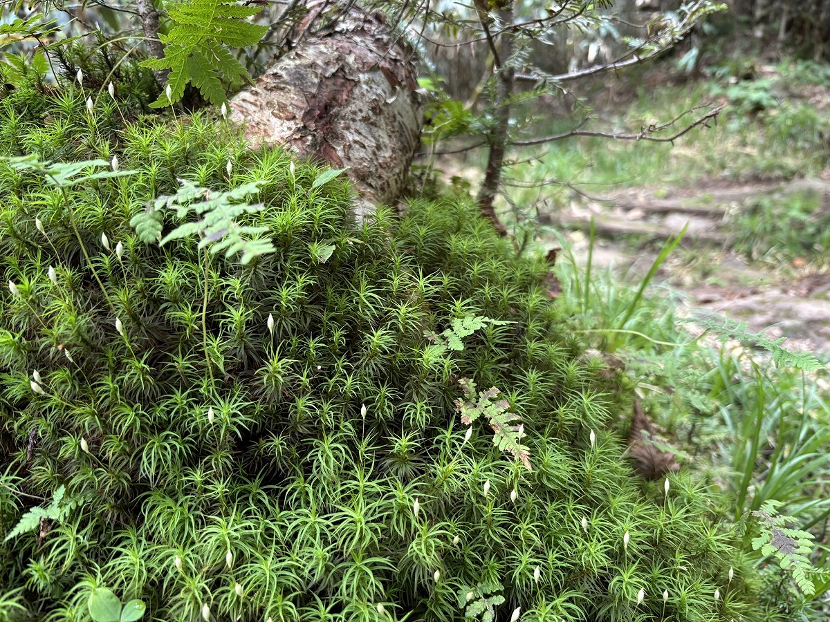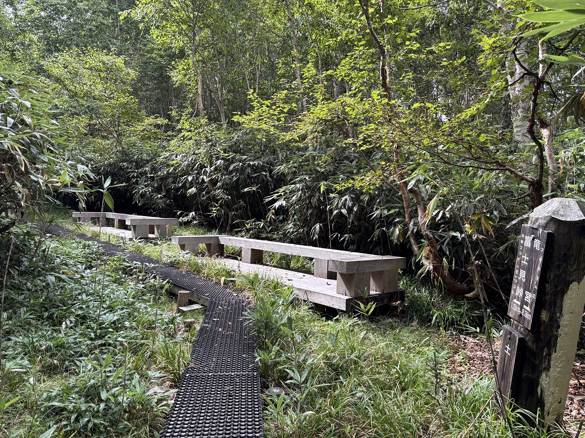 岩や切り株についた緑鮮やかなコケに癒されながら歩き、滑り止めマットの敷かれた木道が現れるころになると傾斜が緩くなり、ベンチのある場所に着きます。富士見峠まであと約1.3km、緩やかな登山道をもうひと登りです。