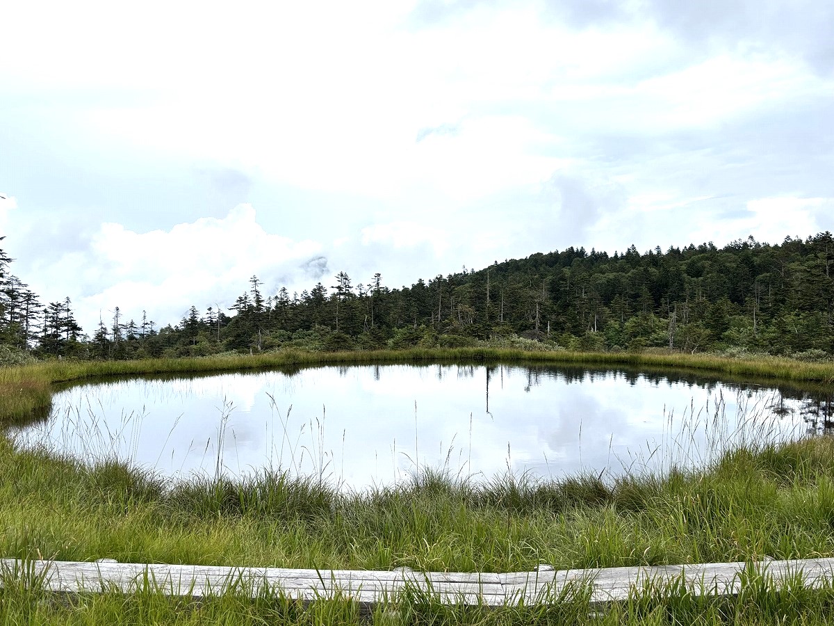 長沢新道を登りきって、登山道を少し左に逸れたところに池塘があります。晴れていると、池塘越しに燧ケ岳が見えます。ベンチがあるので、休憩して景色をお楽しみください。
