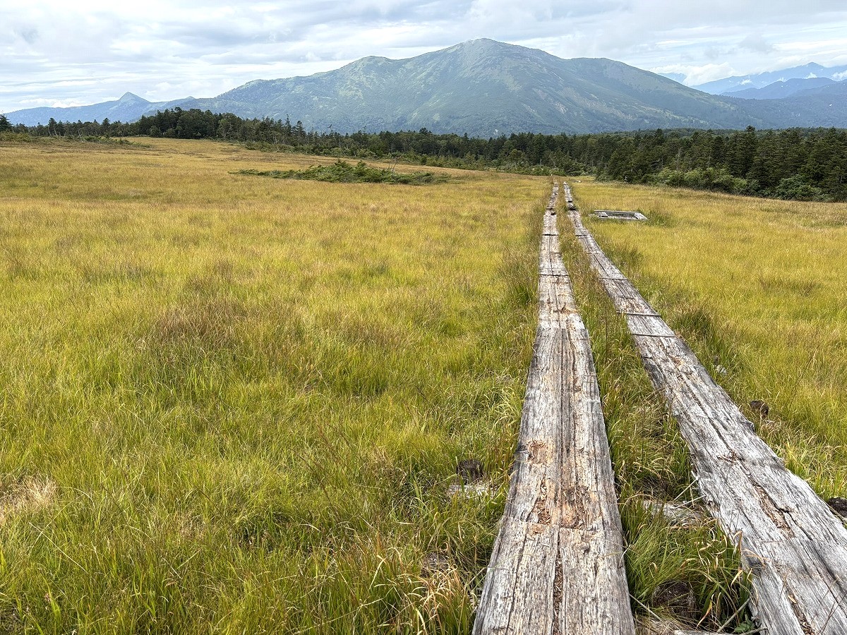 アヤメ平の西に広がる、やや傾斜のついた湿原です。木道の向こうに、美しい形をした至仏山を眺めることができます。