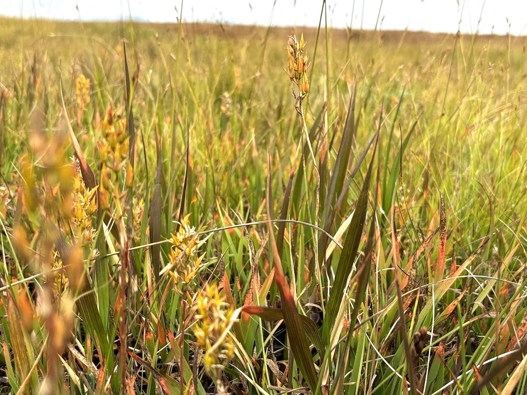 来た道を少し戻ってさらに西へ進むと、アヤメ平に到着します。アヤメ平は、大きな池塘が点在する広々とした湿原です。キンコウカの実や葉の先がオレンジ色になり、湿原の色づきに一役かっていました。天気がいい時は、尾瀬の山々をはじめ武尊山や日光方面の山など、360°の展望が開けます。
