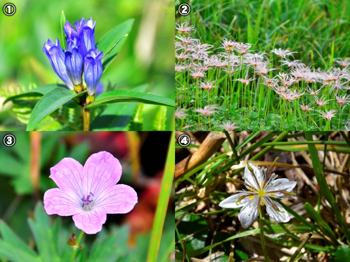 ①緑色の稜線ではオヤマリンドウの青いシルエットが目立ちます。②駒の大池の周りではチングルマの花穂がふわふわとした綿毛をまといゆらゆらと揺れています。③ハクサンフウロは一株だけ花の姿を見る事ができました。湿原は夏から秋へ移りつつありましたが、夏のなごりを少しだけ、感じさせてくれました。④季節外れのミツバオウレンが一株だけ、駒の小屋のトイレの向かいにひっそりと咲いていました。トイレを出てすぐのところにありますのでよく目を凝らして湿原内をのぞき込んでみましょう。