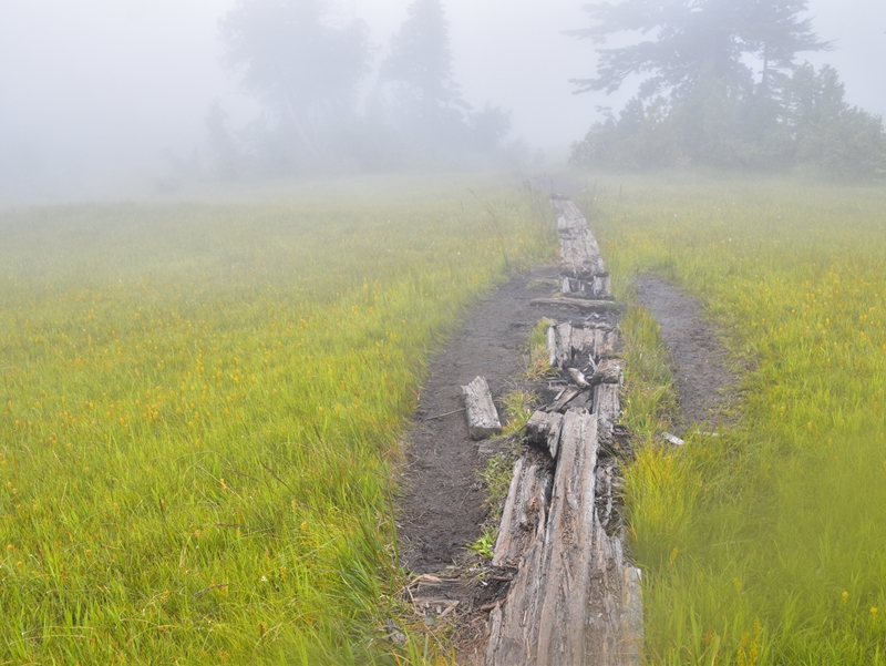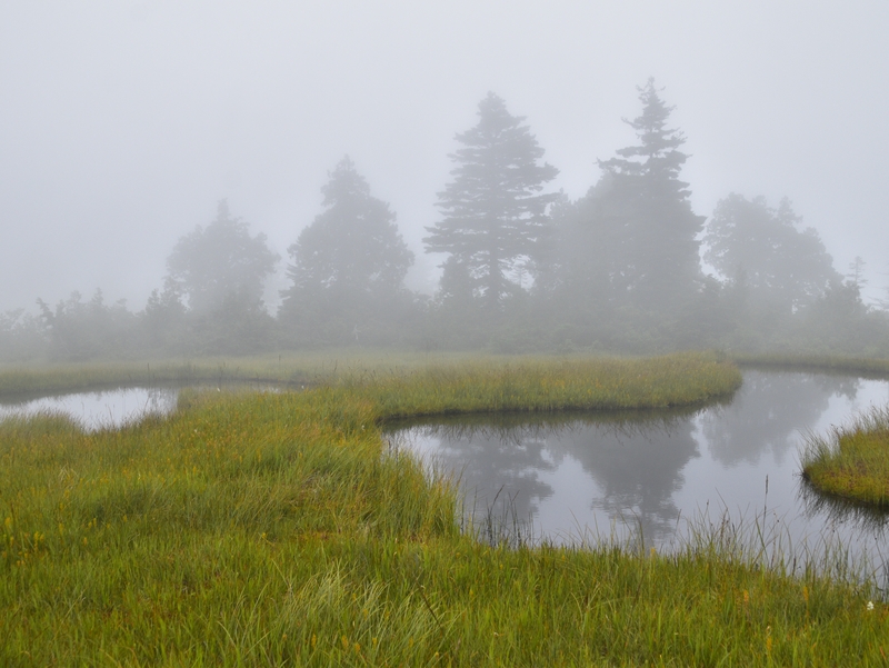 草紅葉はまだ先ですが、キンコウカの数も多く、鮮やかな様相が見られるのではないかと期待が高まります。山霧の中、オオシラビソのシルエットが池塘に写り、ゆらゆらとゆらめく姿が印象的でした。