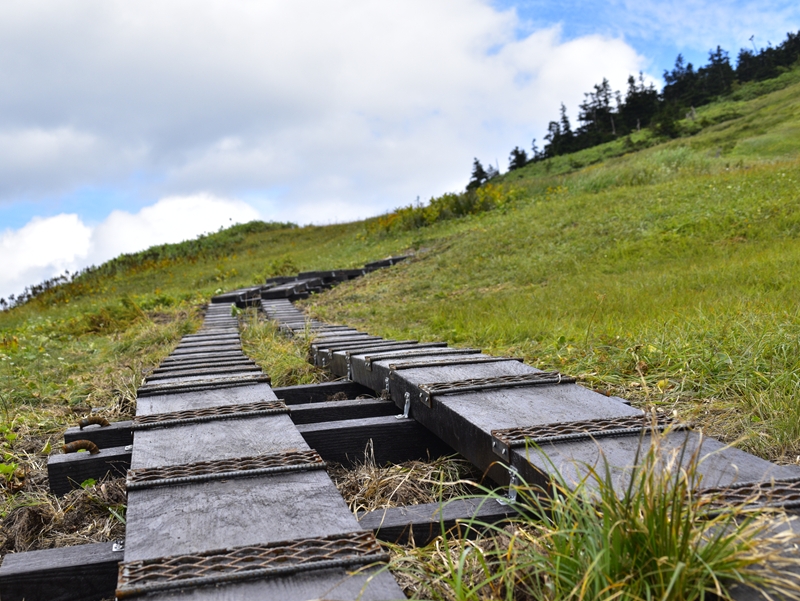 会津駒ヶ岳では毎年、少しずつ木道を新しく敷設し直しています。木道敷設にはヘリコプターによる資材搬送を伴うため、莫大なコストがかかります。また、工員の方は数週間に渡って、山小屋に缶詰になり作業を行うなど、様々な努力が必要となります。木道を長持ちさせるためにも、くれぐれもアイゼンをつけたまま木道上を歩かないようお気をつけ下さい。