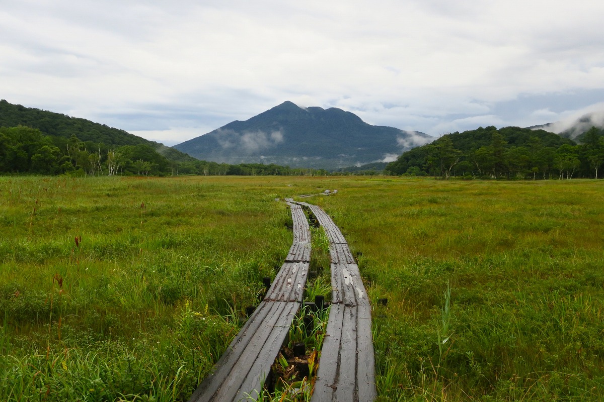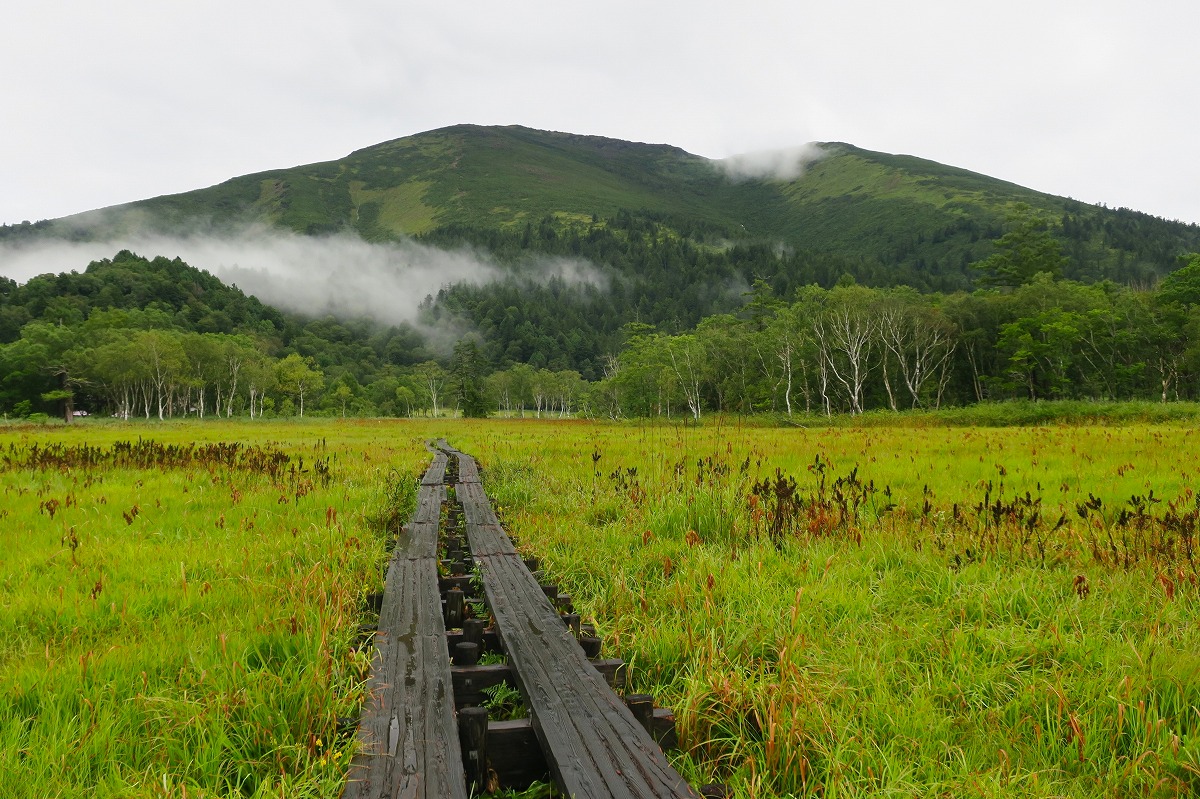 しっとりと濡れた湿原の向こうには、尾瀬を見守るように佇む至仏山や燧ヶ岳の姿をくっきりと見ることができました。